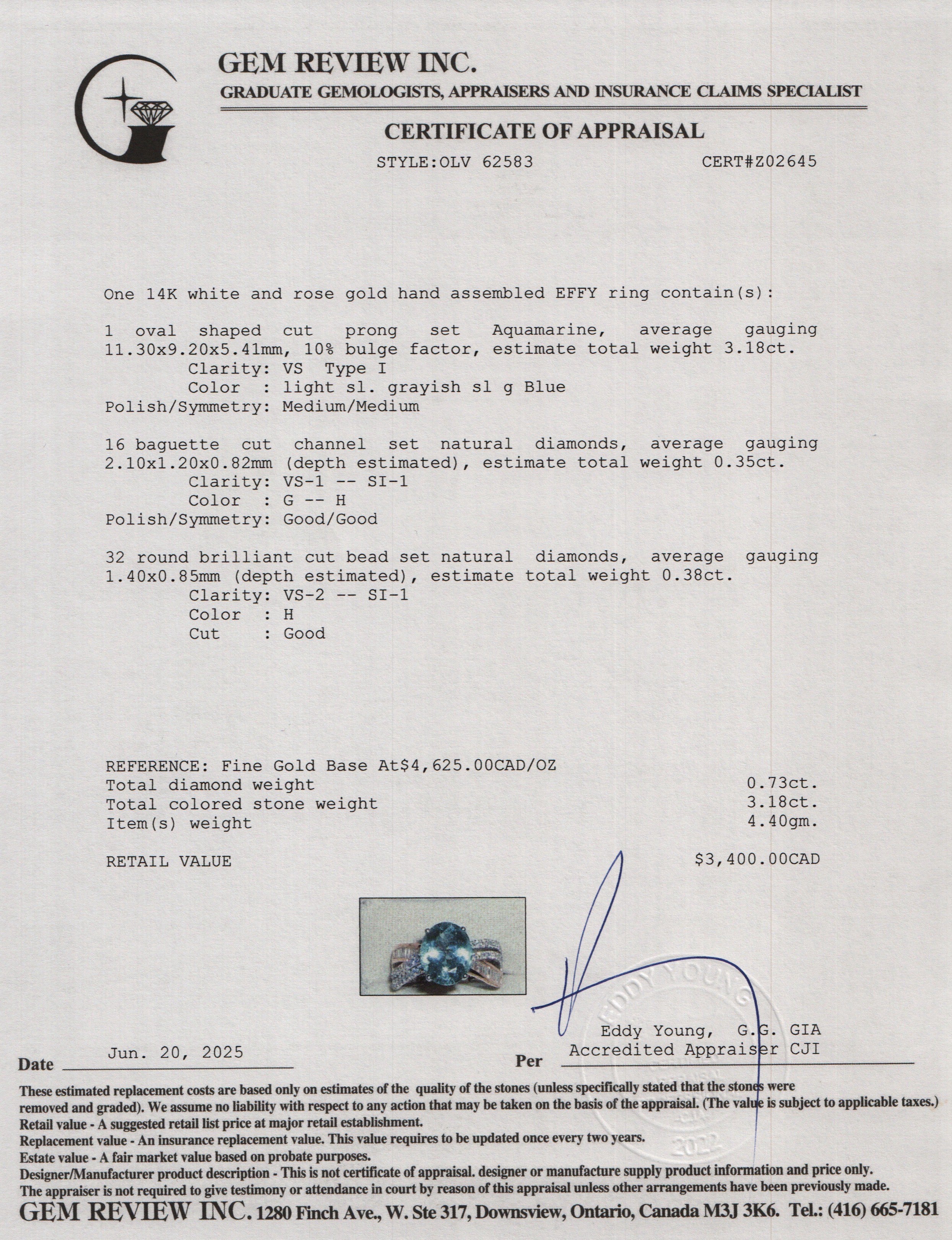 Effy 14k White & Rose Gold Aquamarine & Diamond Ring, Size 7