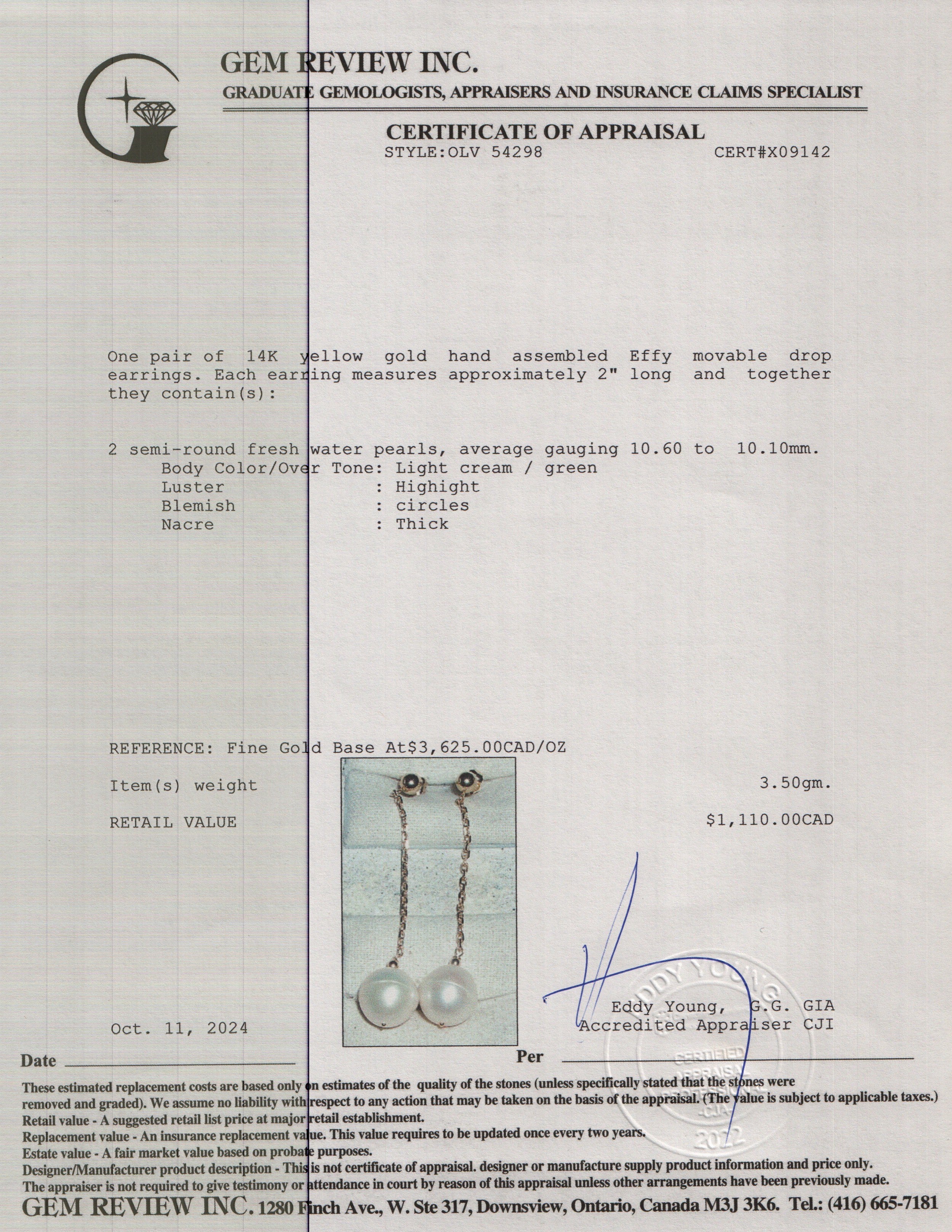 Earrings Length 2", Pearl 10.10 mm-10.60 mm