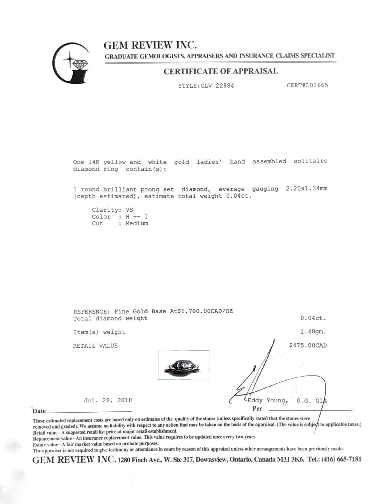 - 1 Round Brilliant Cut Diamond Weighing Approximately 0.04 ct. of VS Clarity, H-I Colour, Medium Cut