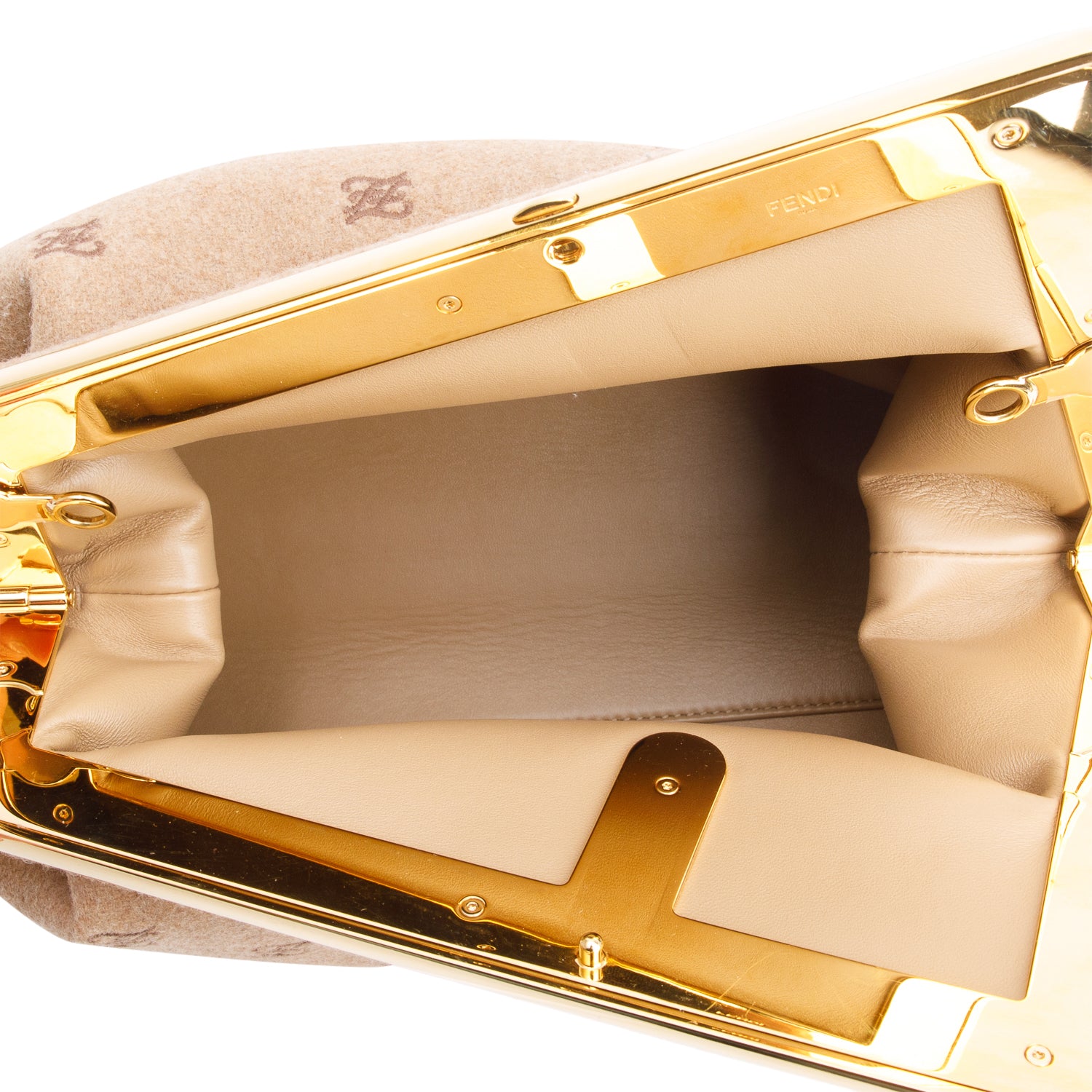 Beige Flannel Karligraphy Embroidered Medium First Bag w/ Strap