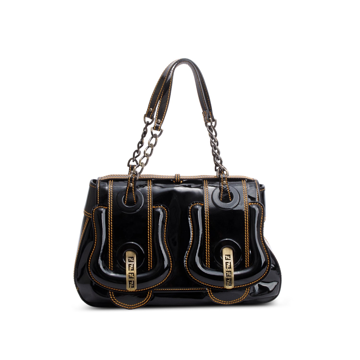 Condition: Very Good; minor scratches at hardware and exterior patent leather; slight marks and wear at interior suede flap.