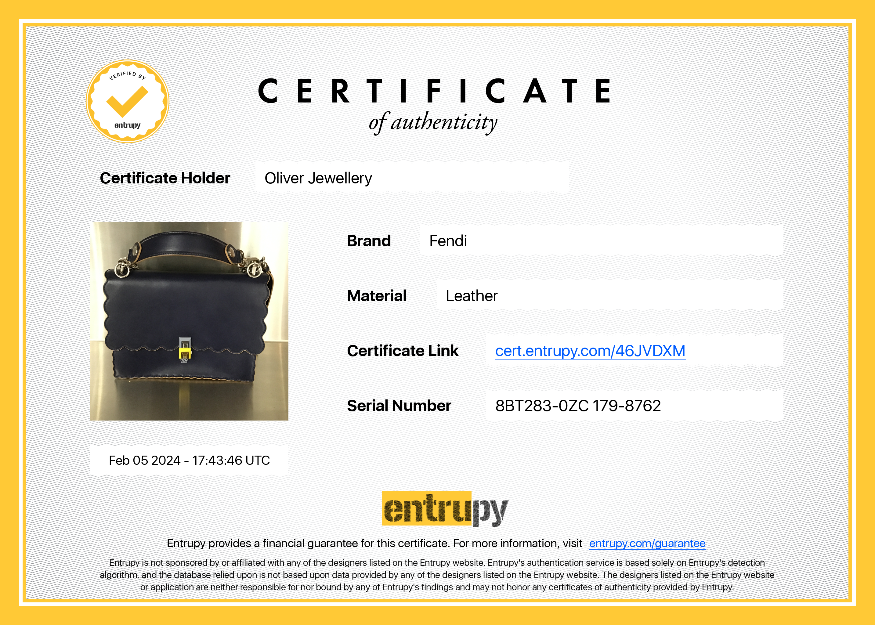 Dust Bag, Tags, Entrupy Certificate of Authenticity