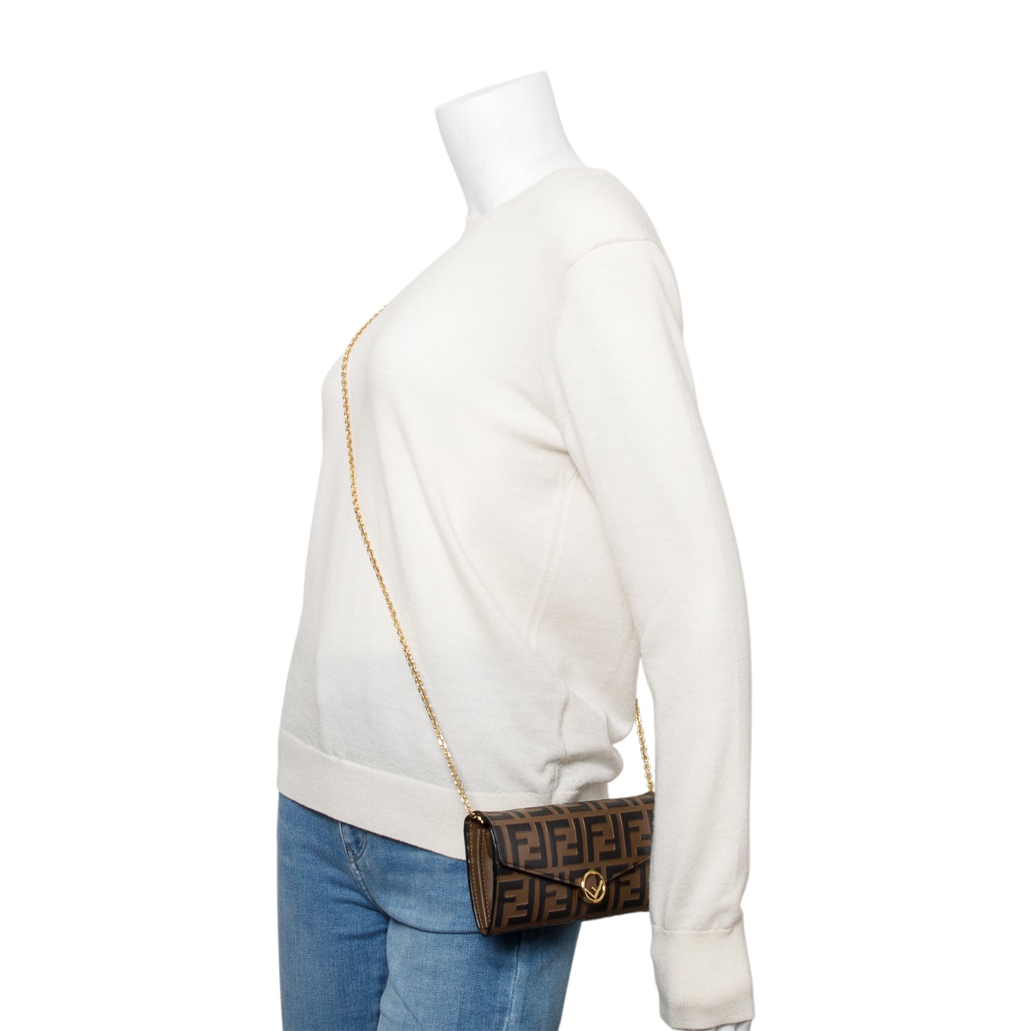 Brown FF Zucca Embossed Leather Continental Wallet on Chain w/ Box