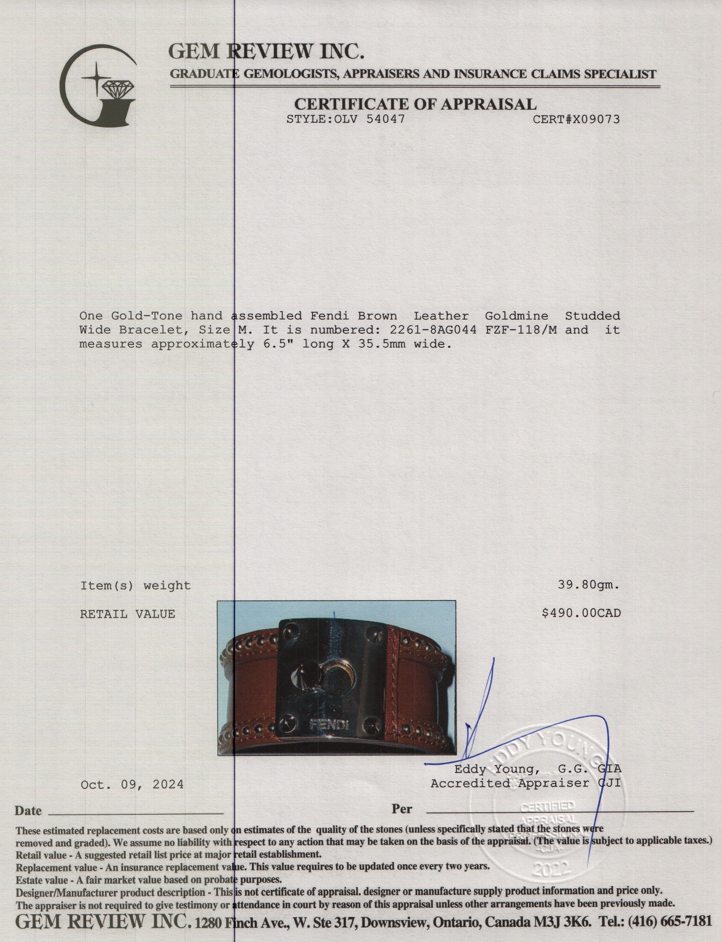 Gold-Tone Metal Brown Leather Goldmine Studded Wide Bracelet, Size M
