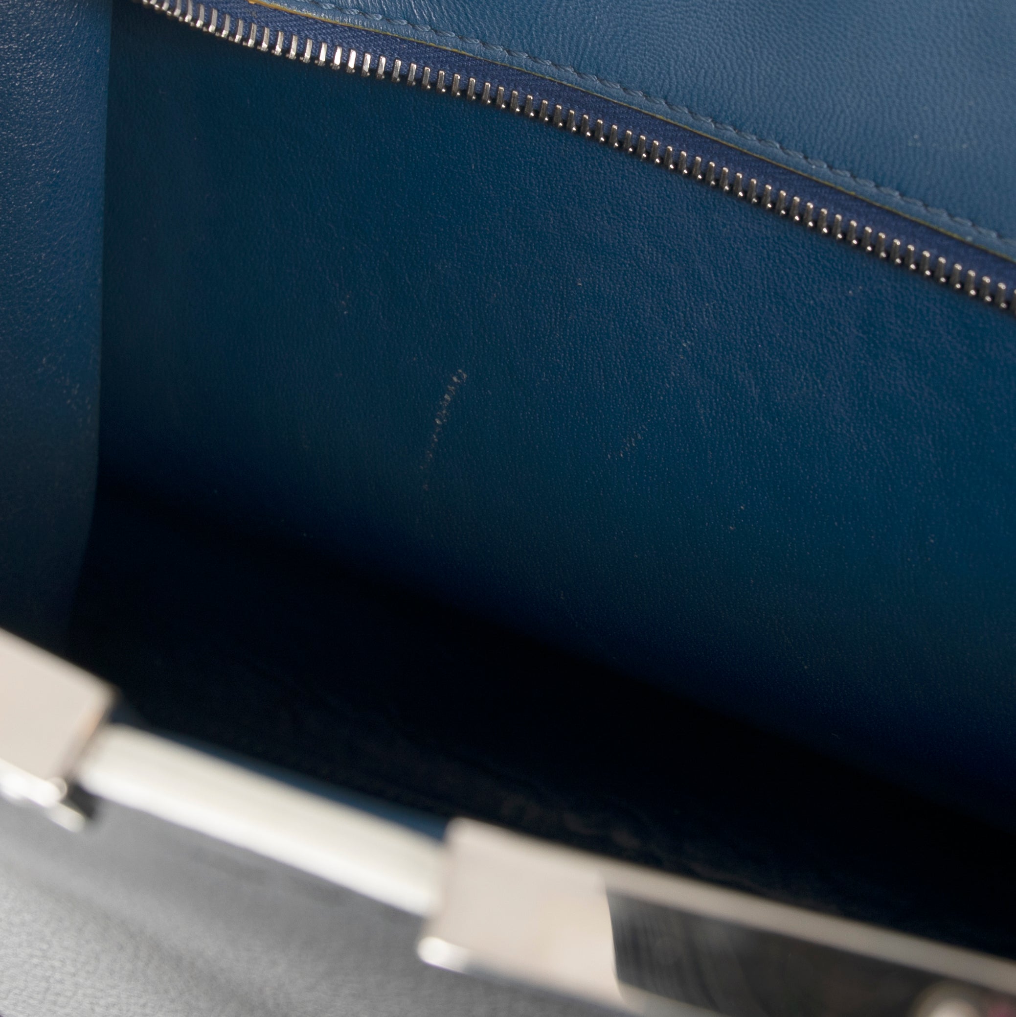 Condition: Good; slight surface scratches at hardware; slight scratches throughout exterior leather; some marks and scratches at interior leather lining