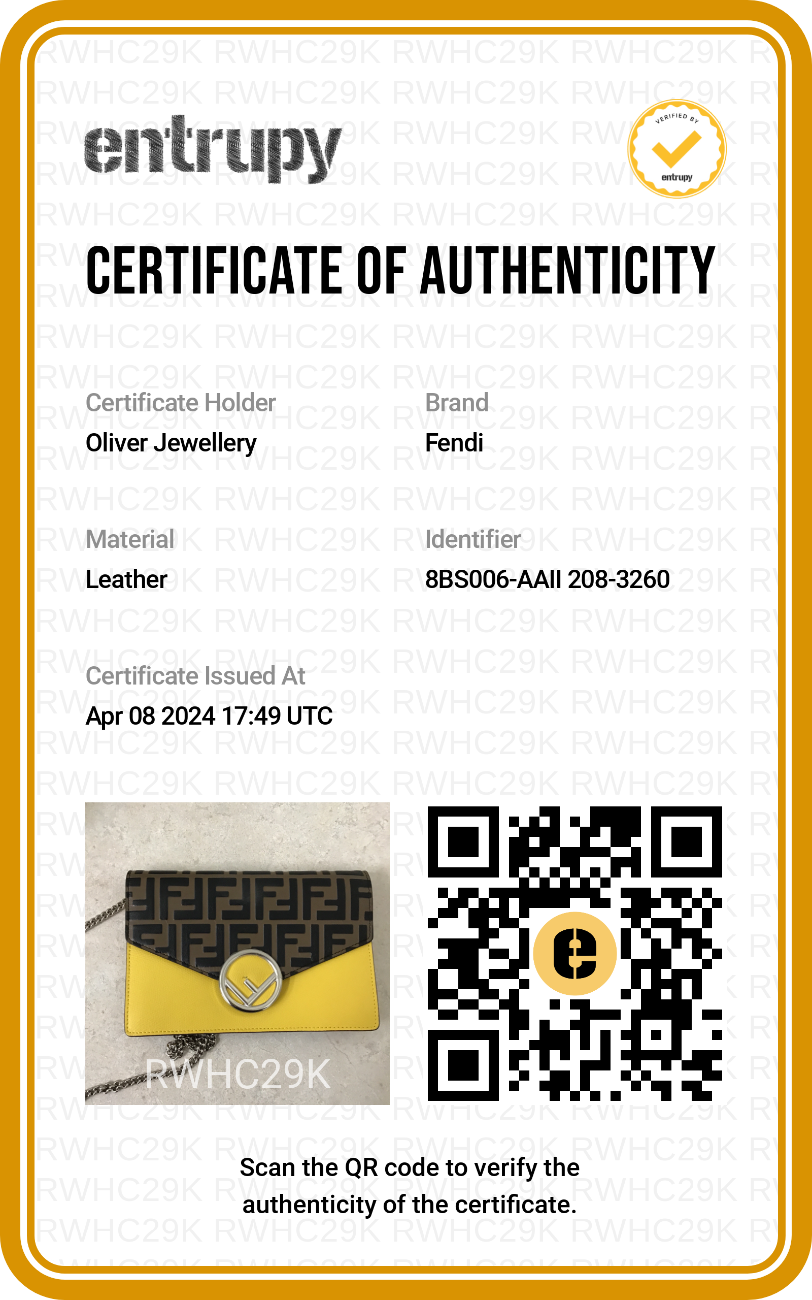 Dust Bag, Strap, Entrupy Certificate of Authenticity
