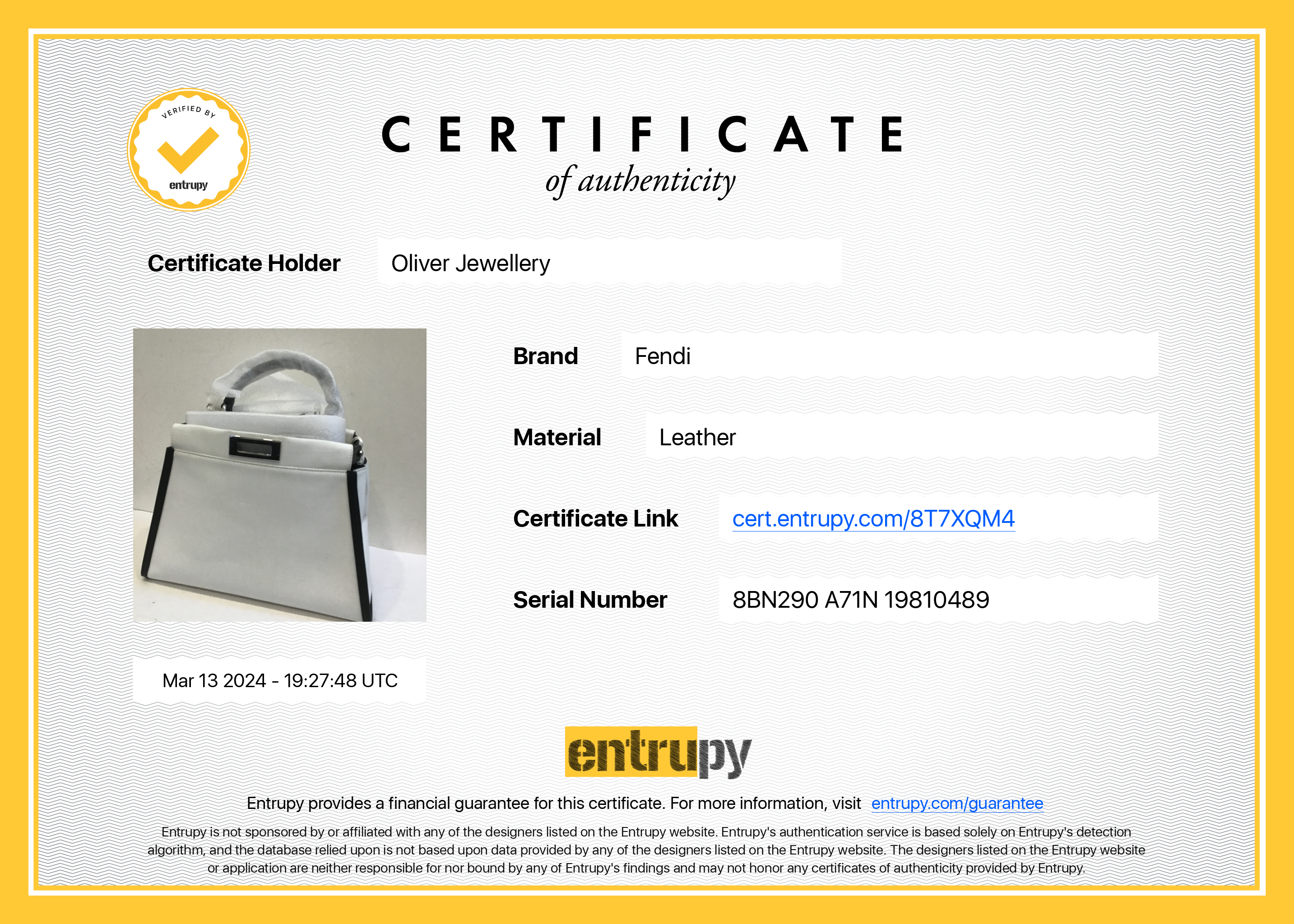 Dust Bag, Tag, Strap, Entrupy Certificate of Authenticity