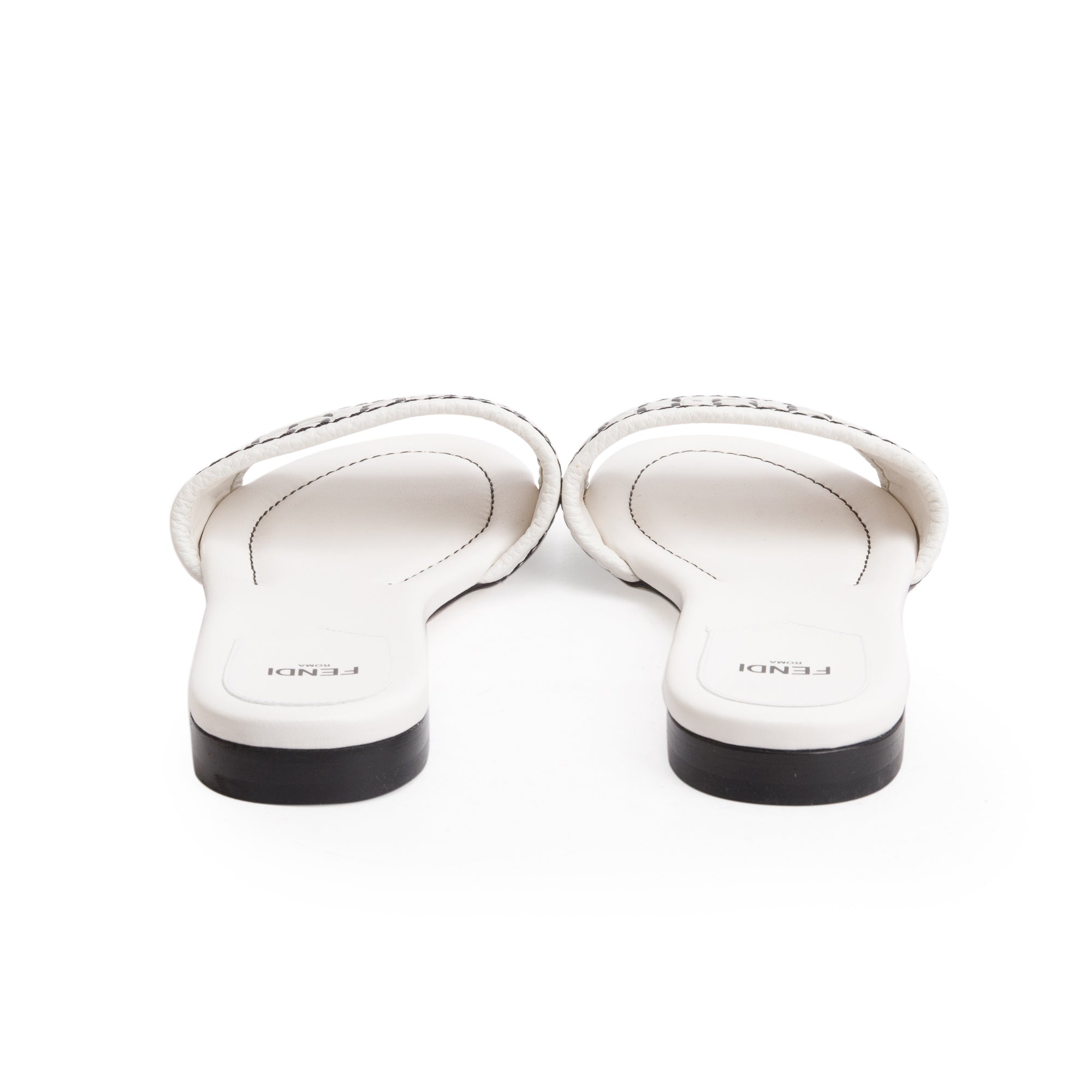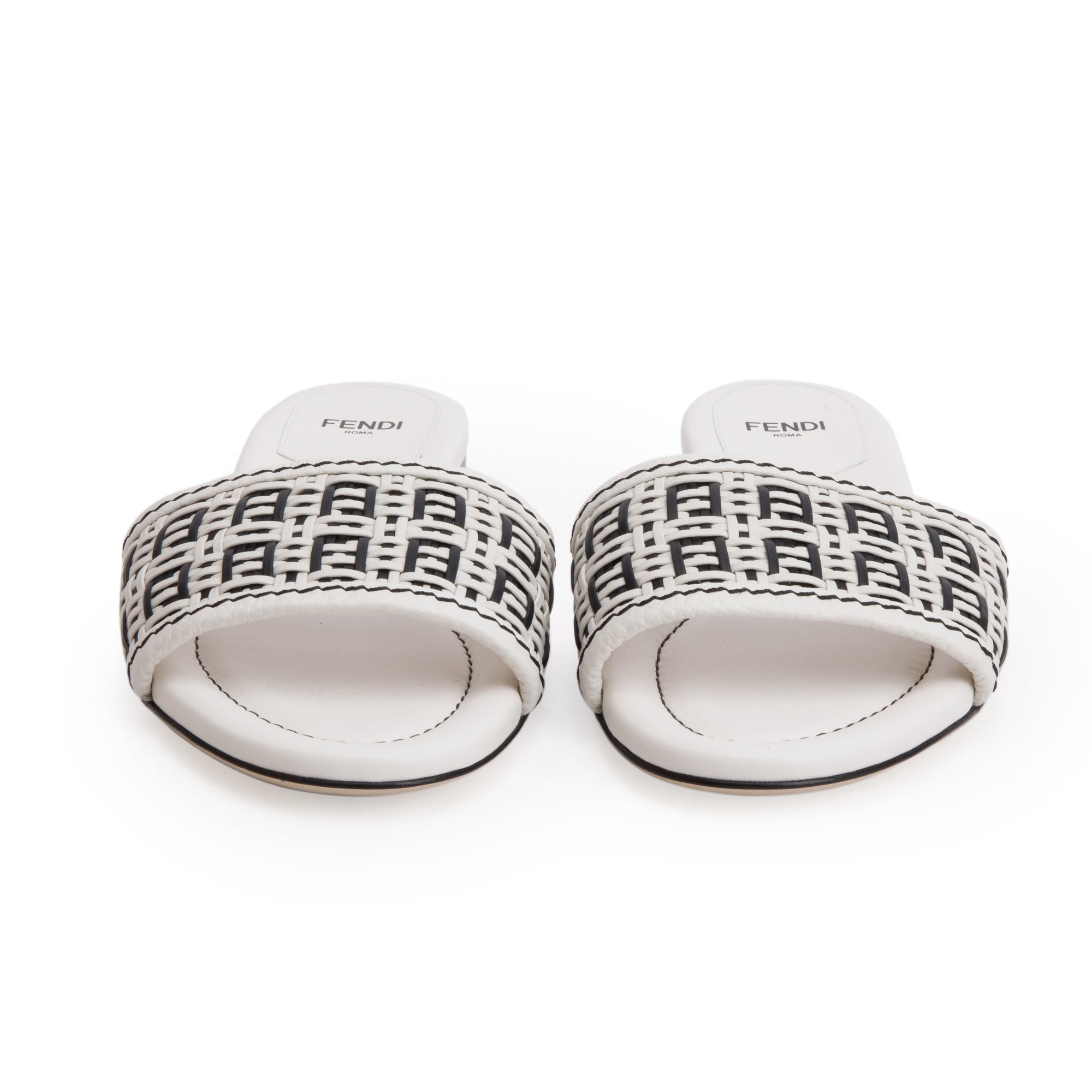 White Calskin Leather Interlaced FF Woven Mule Sandals, Size 37.5 w/ Box