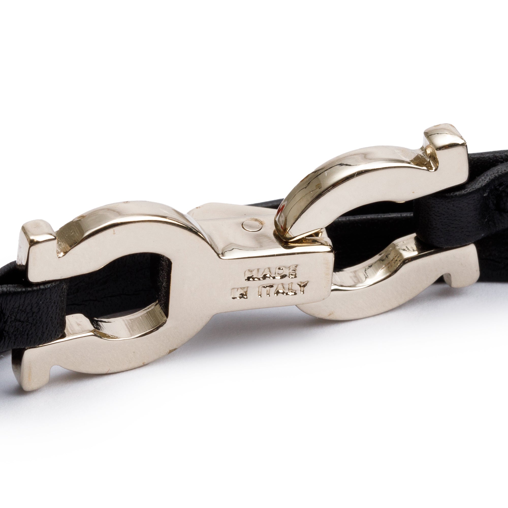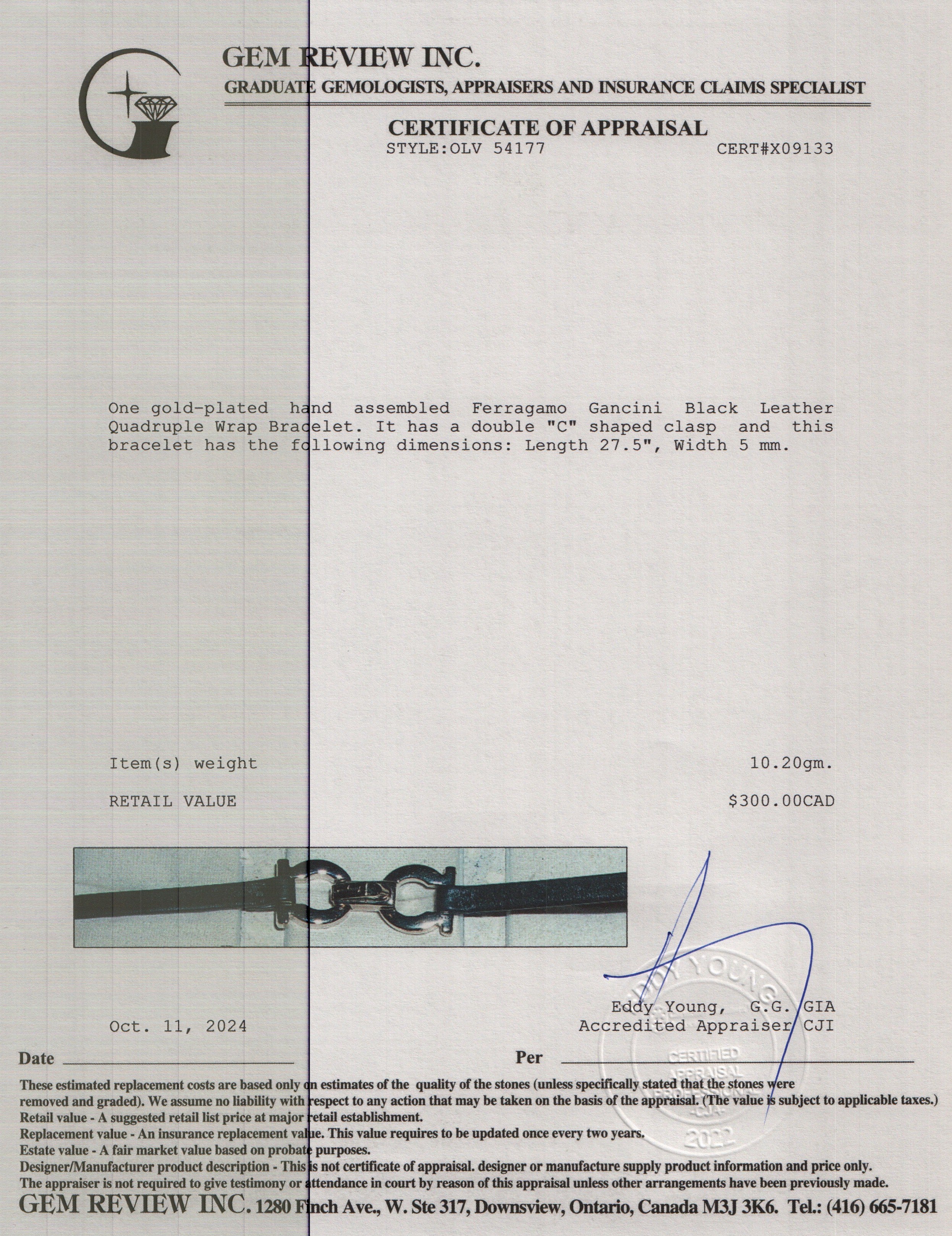 Gold-Plated Gancini Black Leather Quadruple Wrap Bracelet w/ Box