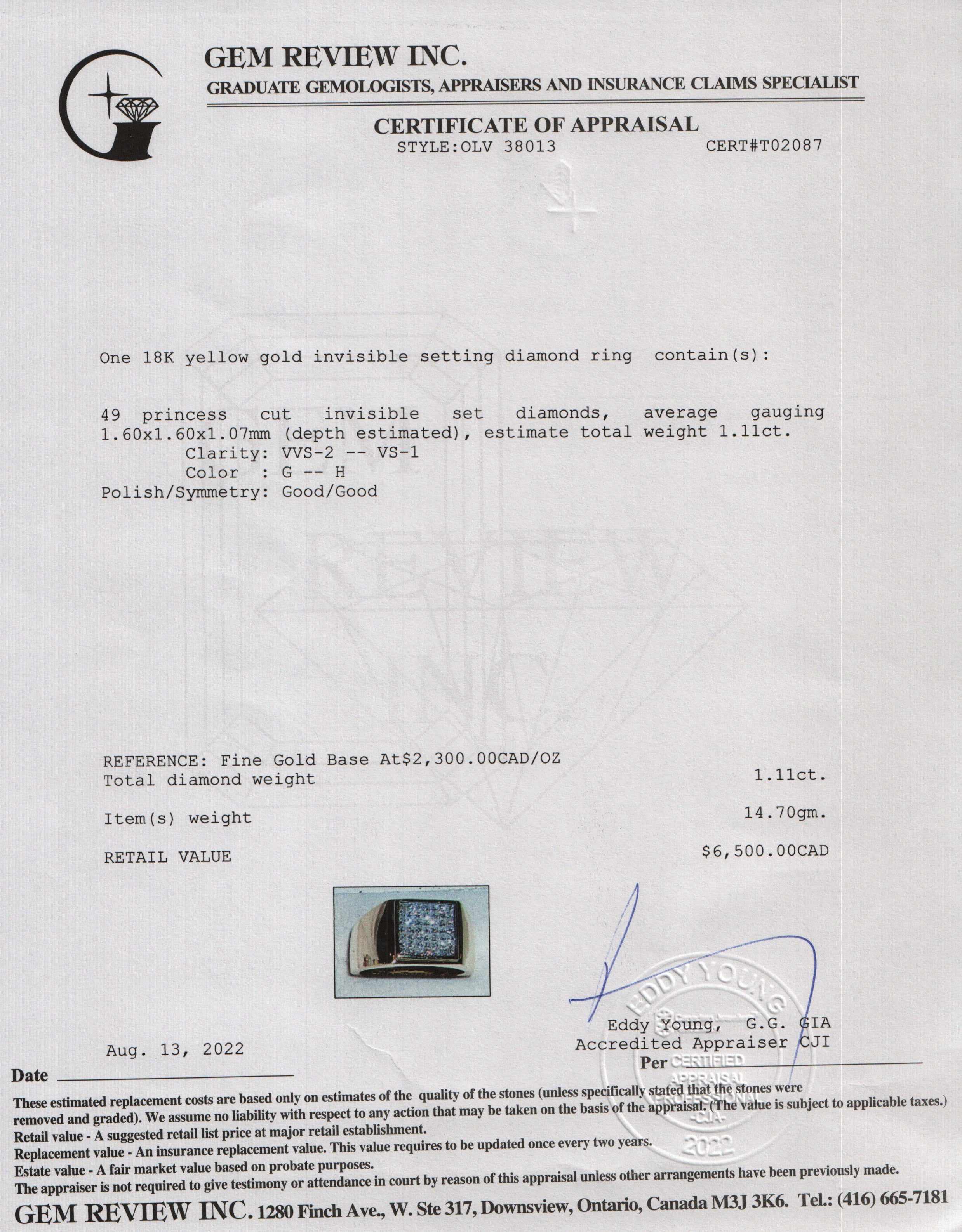 - 49 Princess Cut Invisible Set Diamonds Totalling Approximately 1.11 ct. of VVS2-VS1 Clarity, G-H Colour, Good Cut