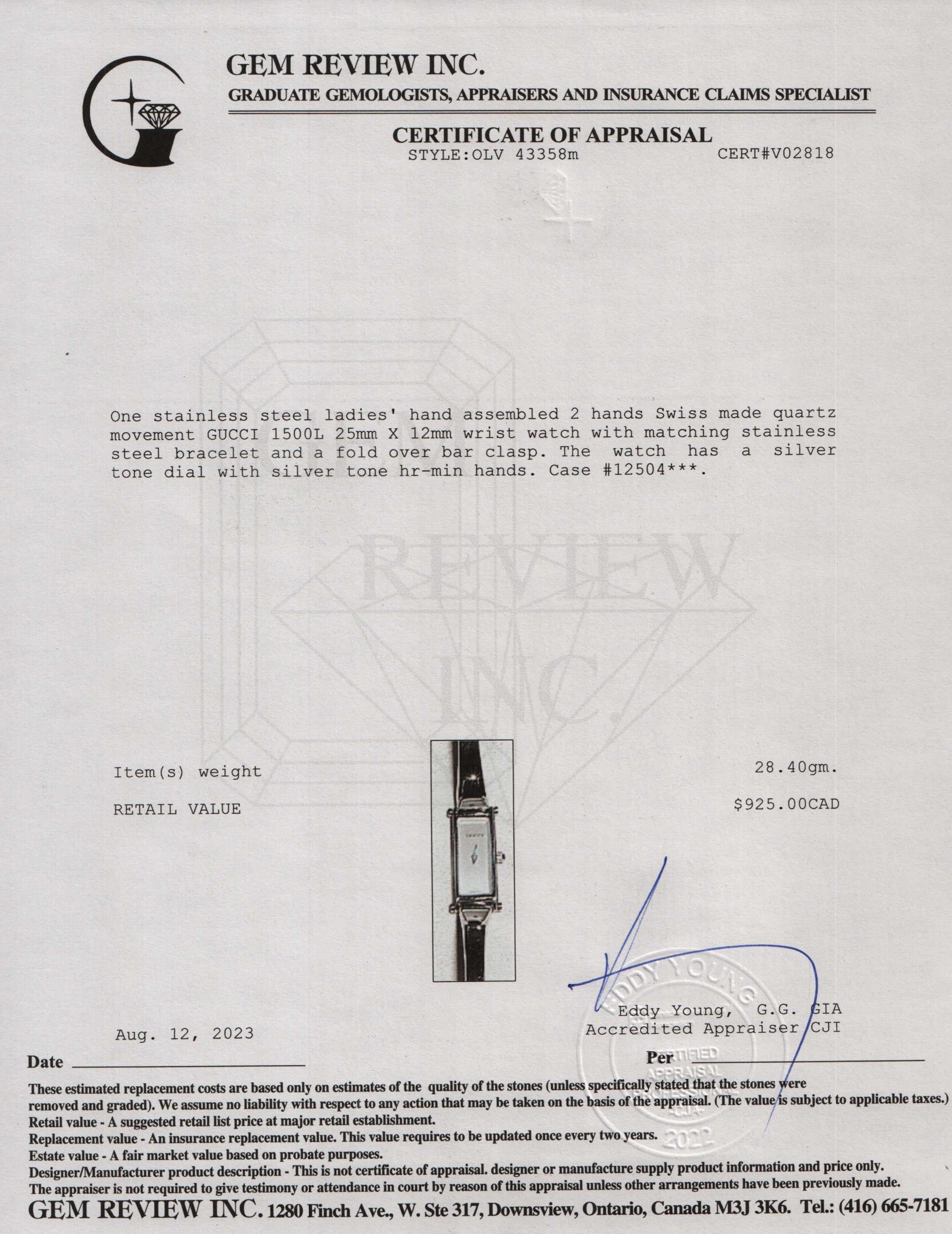 - Signature/Hallmarks: Gucci 1500L 12504***