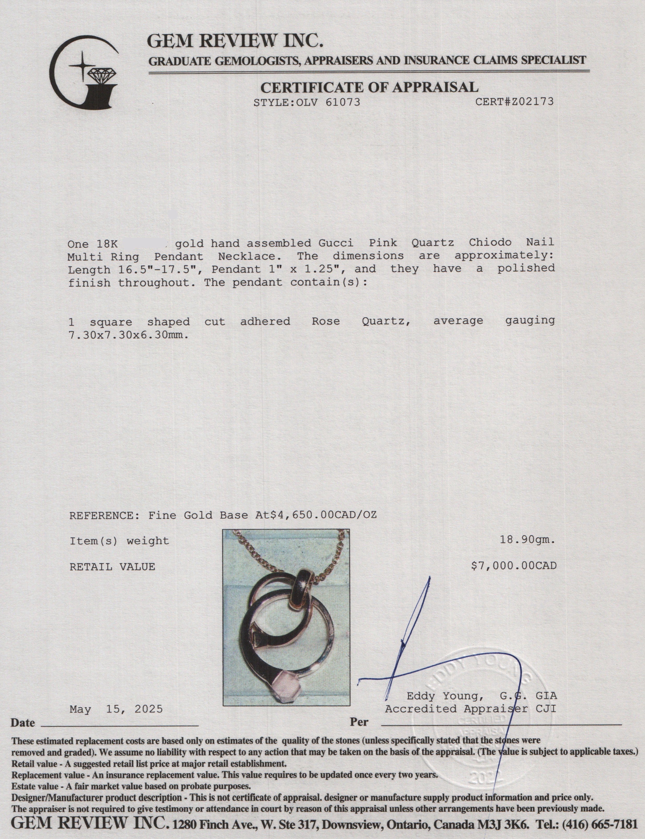 18k Rose Gold Pink Quartz Chiodo Nail Multi Ring Pendant Necklace w/ Box