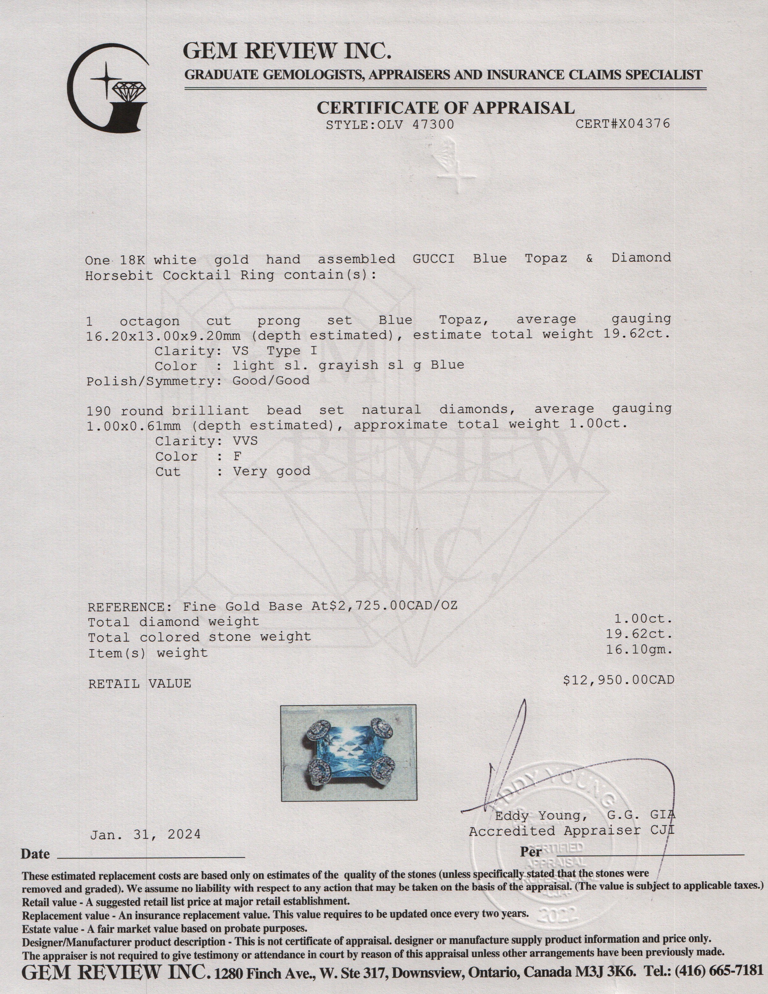 18k White Gold Blue Topaz & Diamond Horsebit Cocktail Ring, Size 4.75