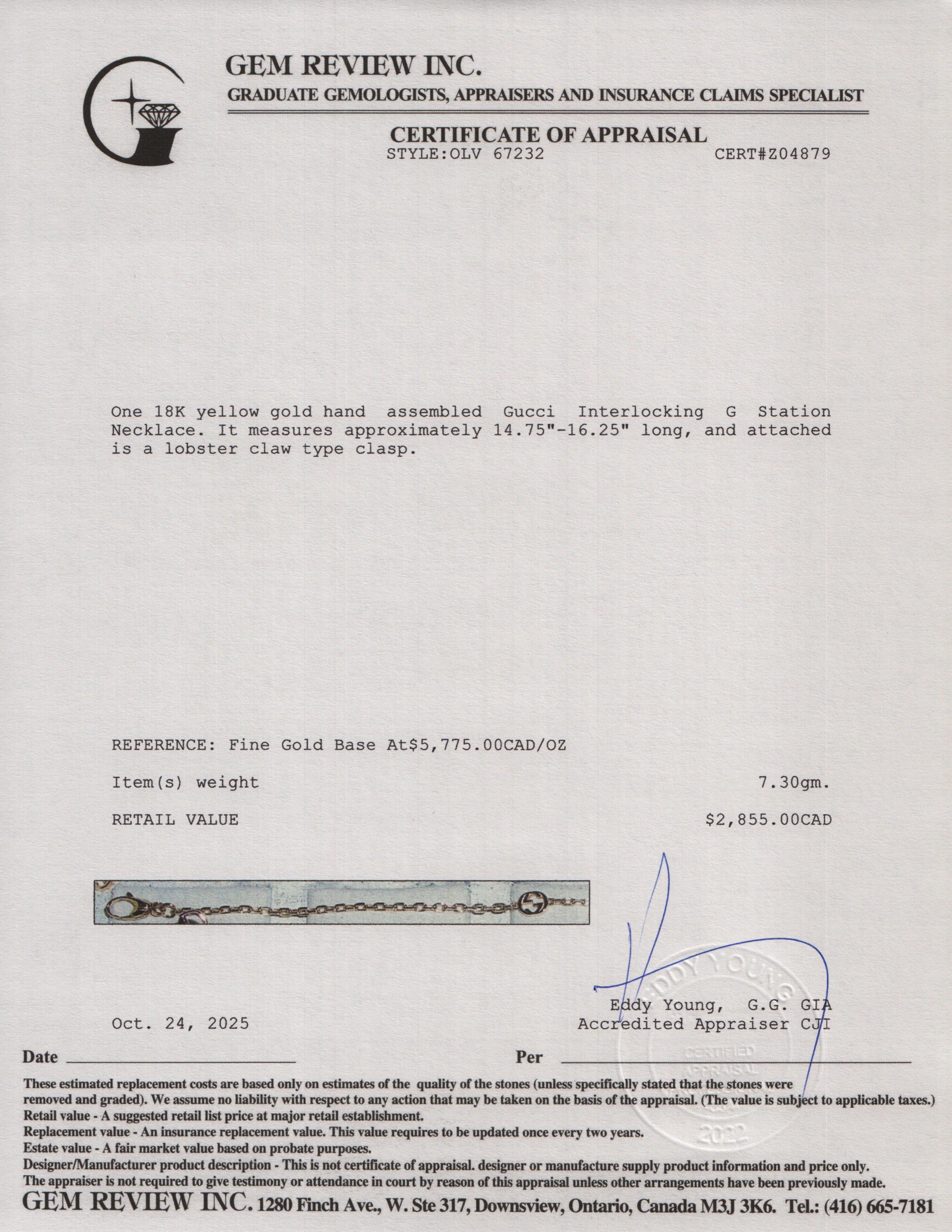 18k Yellow Gold Interlocking G Station Necklace w/ Box & Receipt