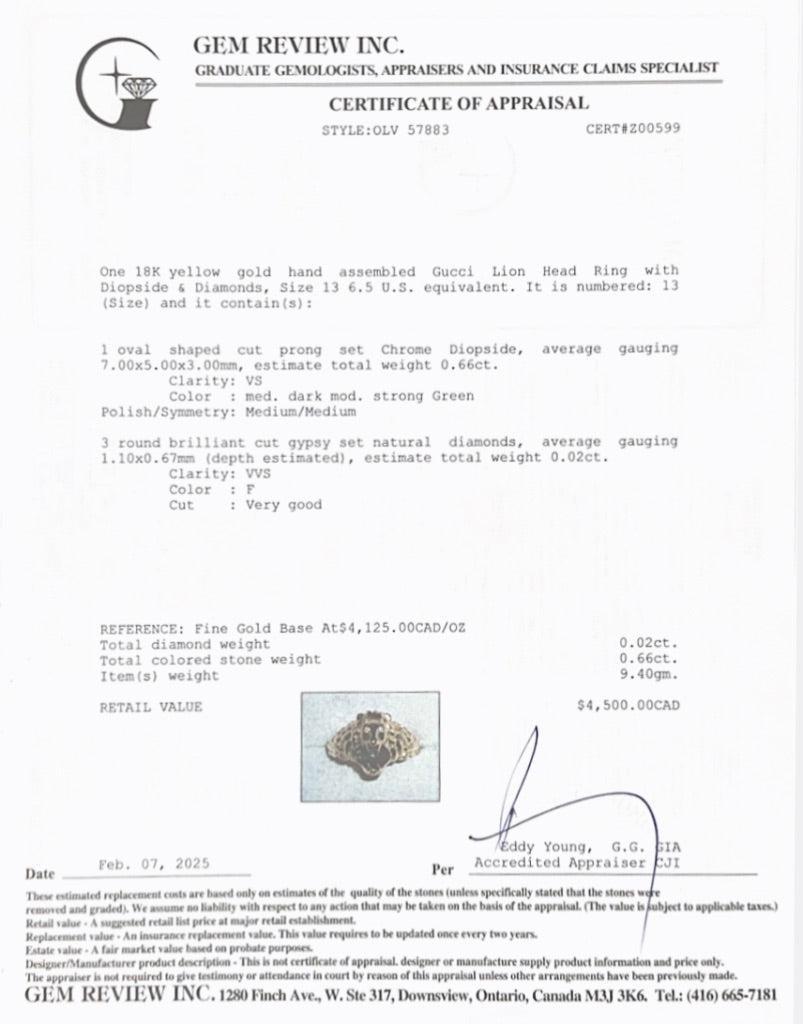 18k Yellow Gold Lion Head Ring with Diopside & Diamonds, Size 13 6.5 w/ Box