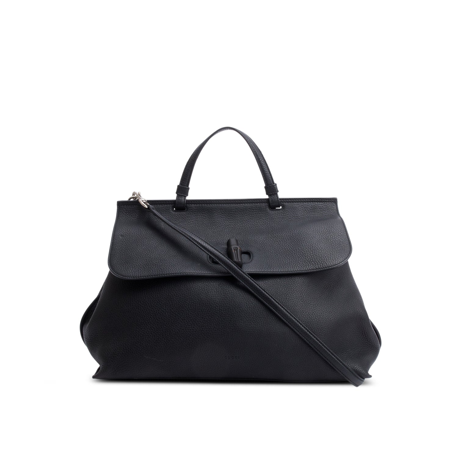 Black Calfskin Leather Large Bamboo Daily Top Handle Bag w/ Strap
