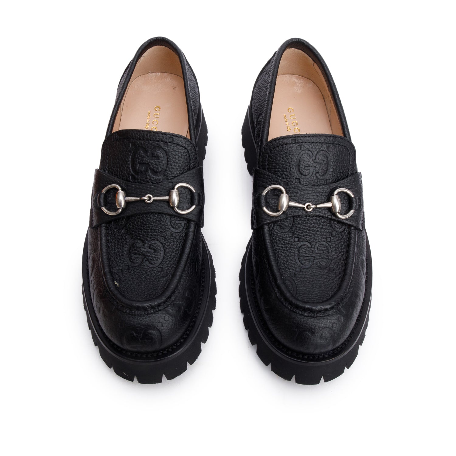 Black GG Embossed Calfskin Leather Horsebit Accent Lug Sole Loafers, Size 39 w/ Box