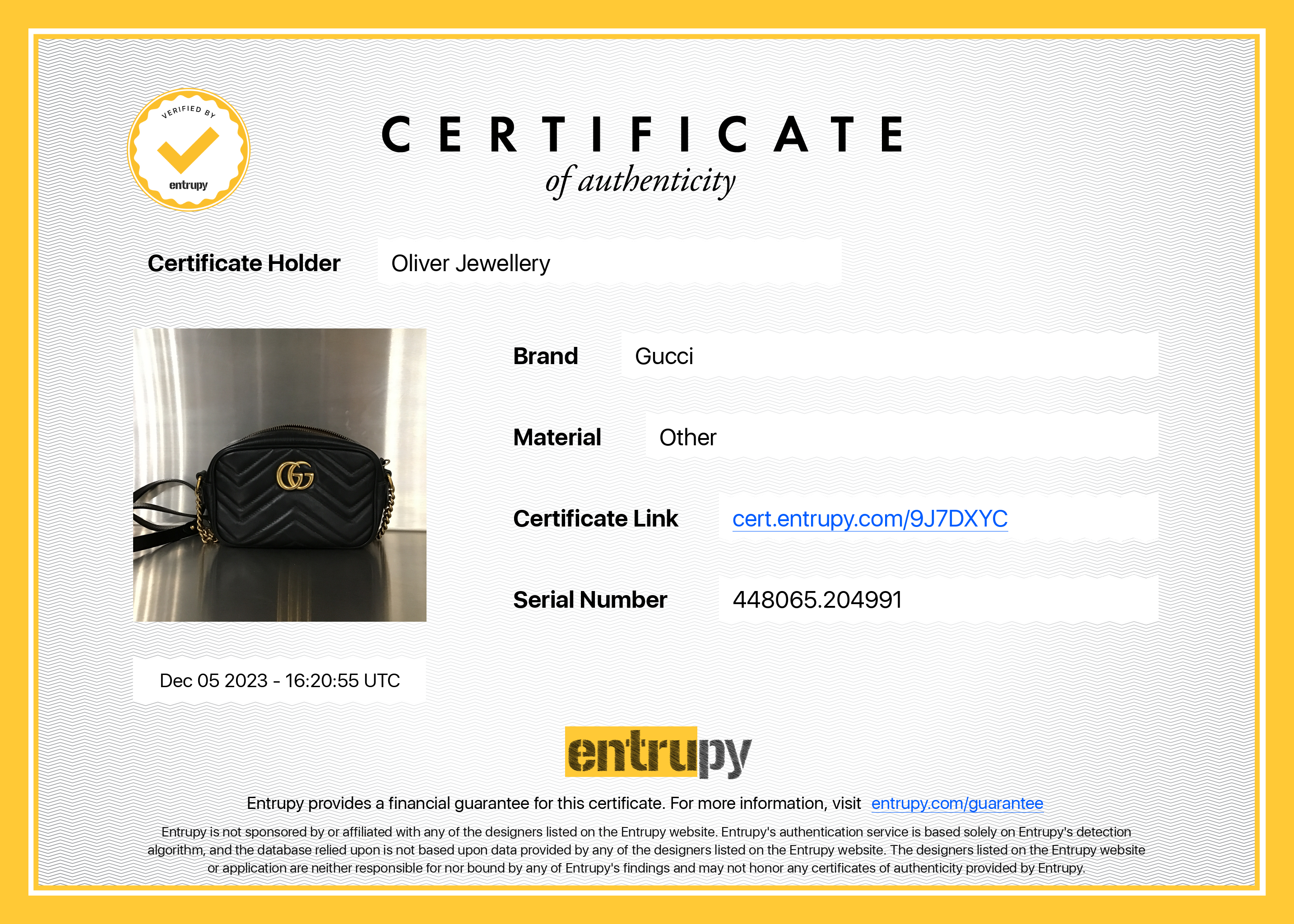 Entrupy Certificate of Authenticity