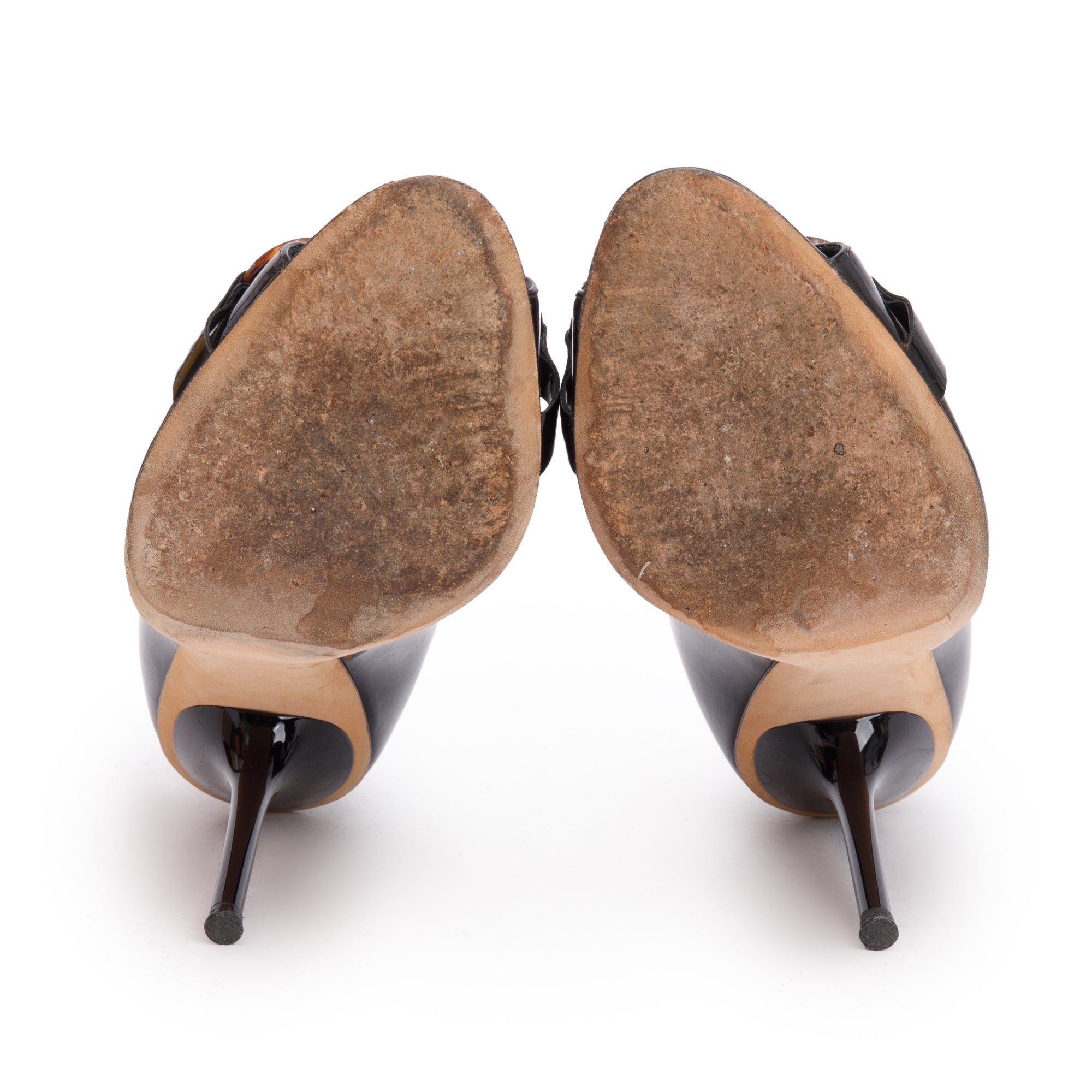 Black Patent Leather Horsebit Peep-Toe Pumps, Size 6