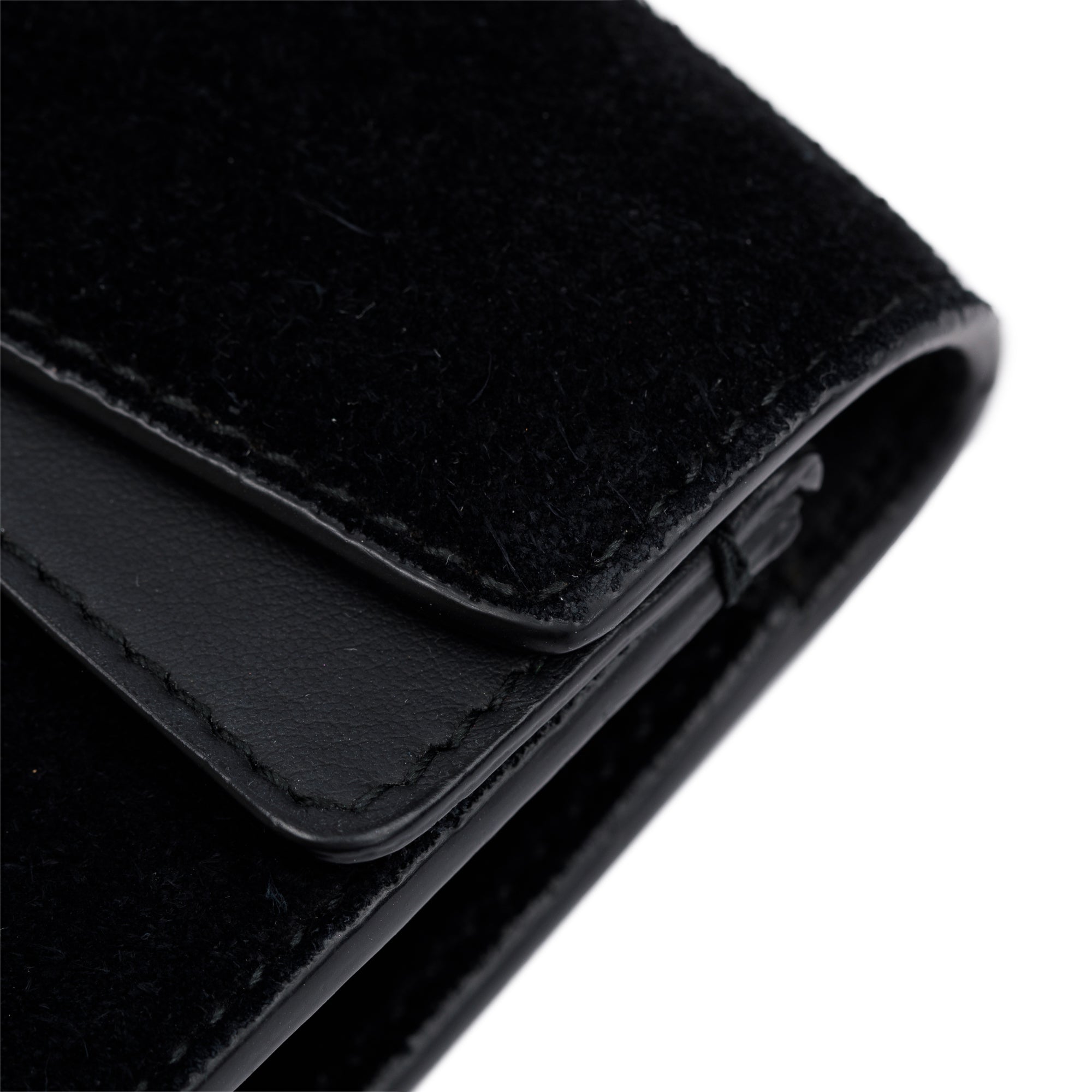 Condition: Very Good; slight wear at exterior suede and corners; light marks at interior suede