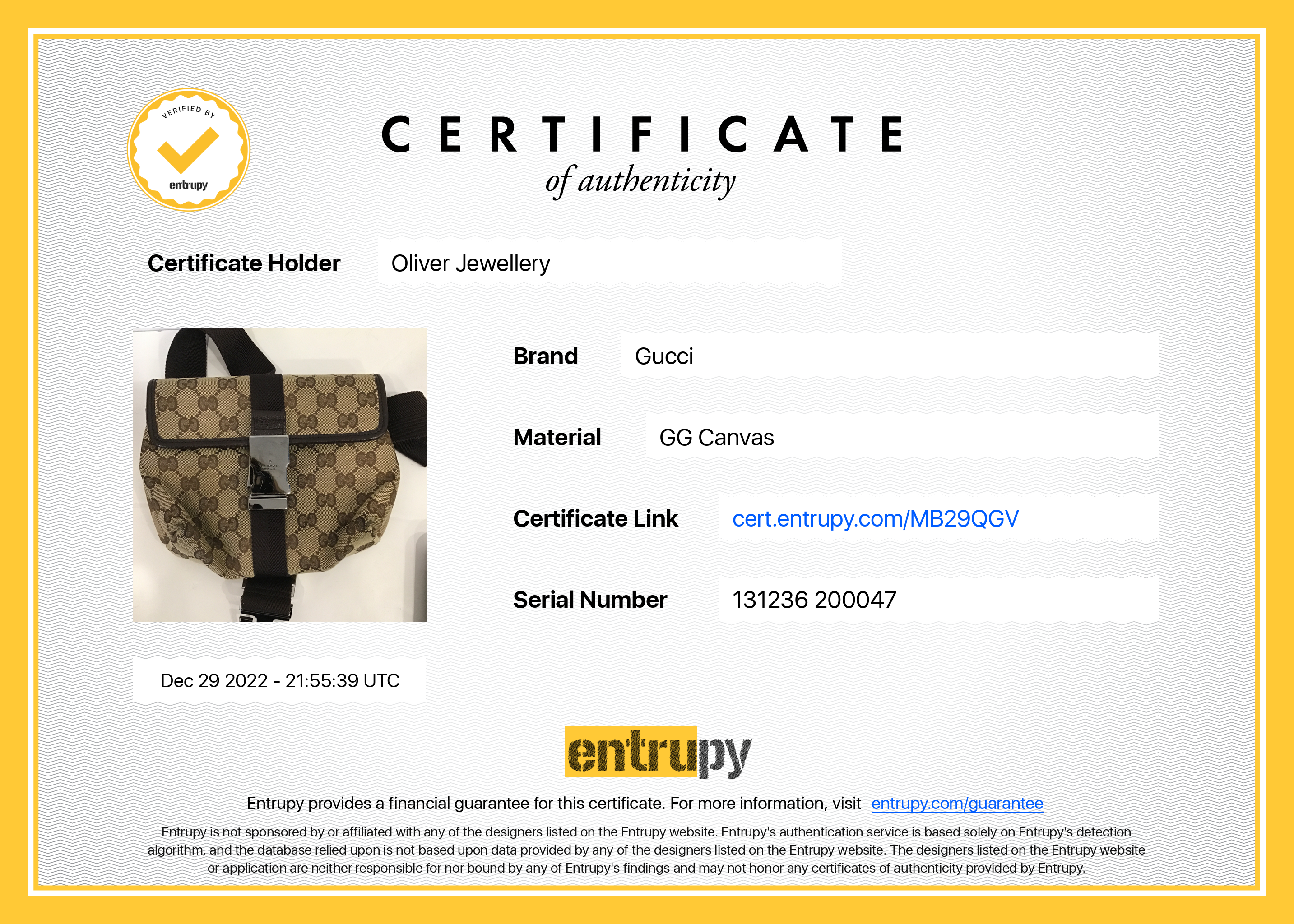 Included Items: Original Gucci Dust Bag and Entrupy Certificate of Authenticity #: MB29QGV