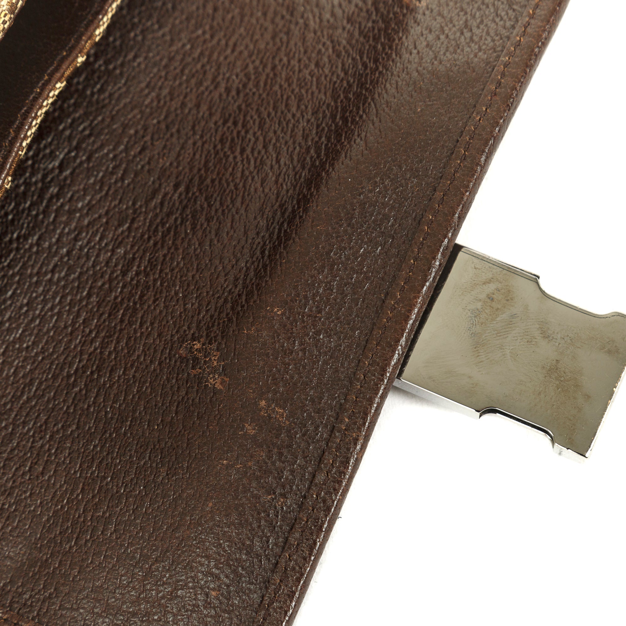 Condition: Very Good; light scratches at hardware; slight scuffing at exterior bottom corners; slight scuffing at interior leather flap underside; clean interior