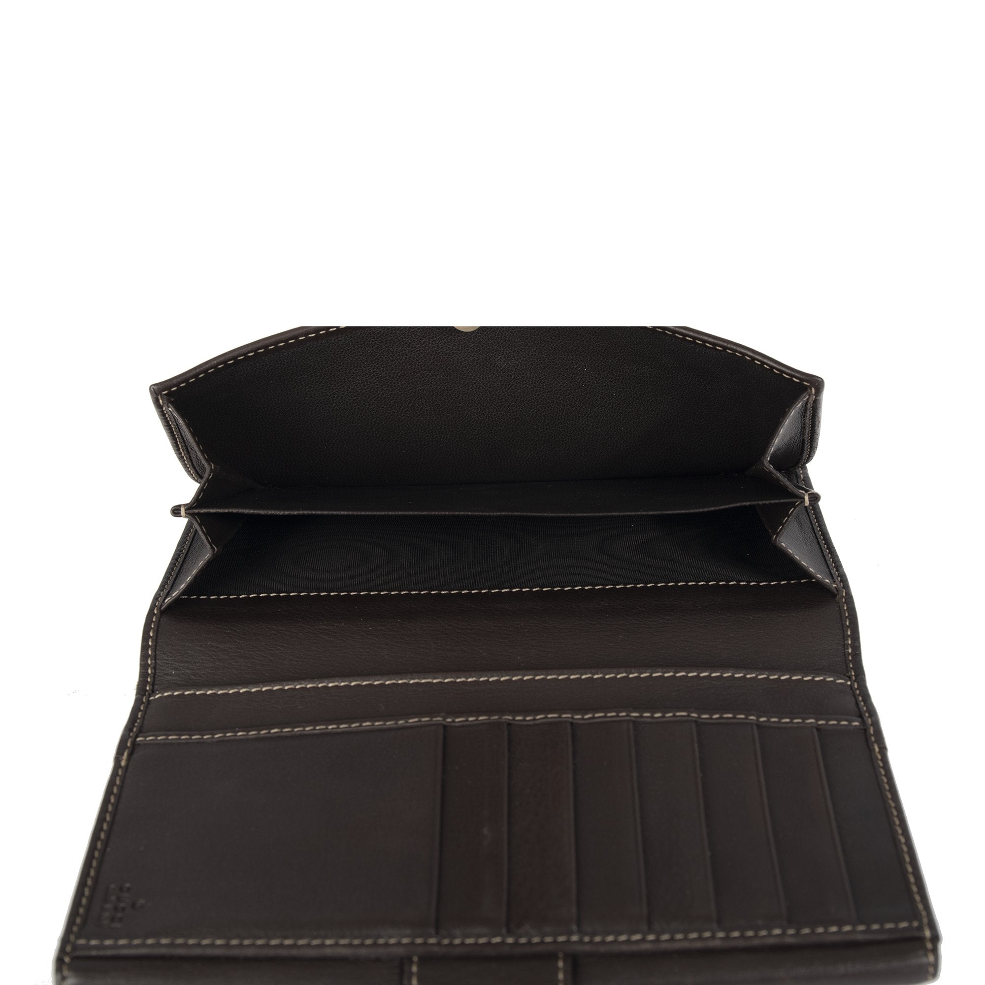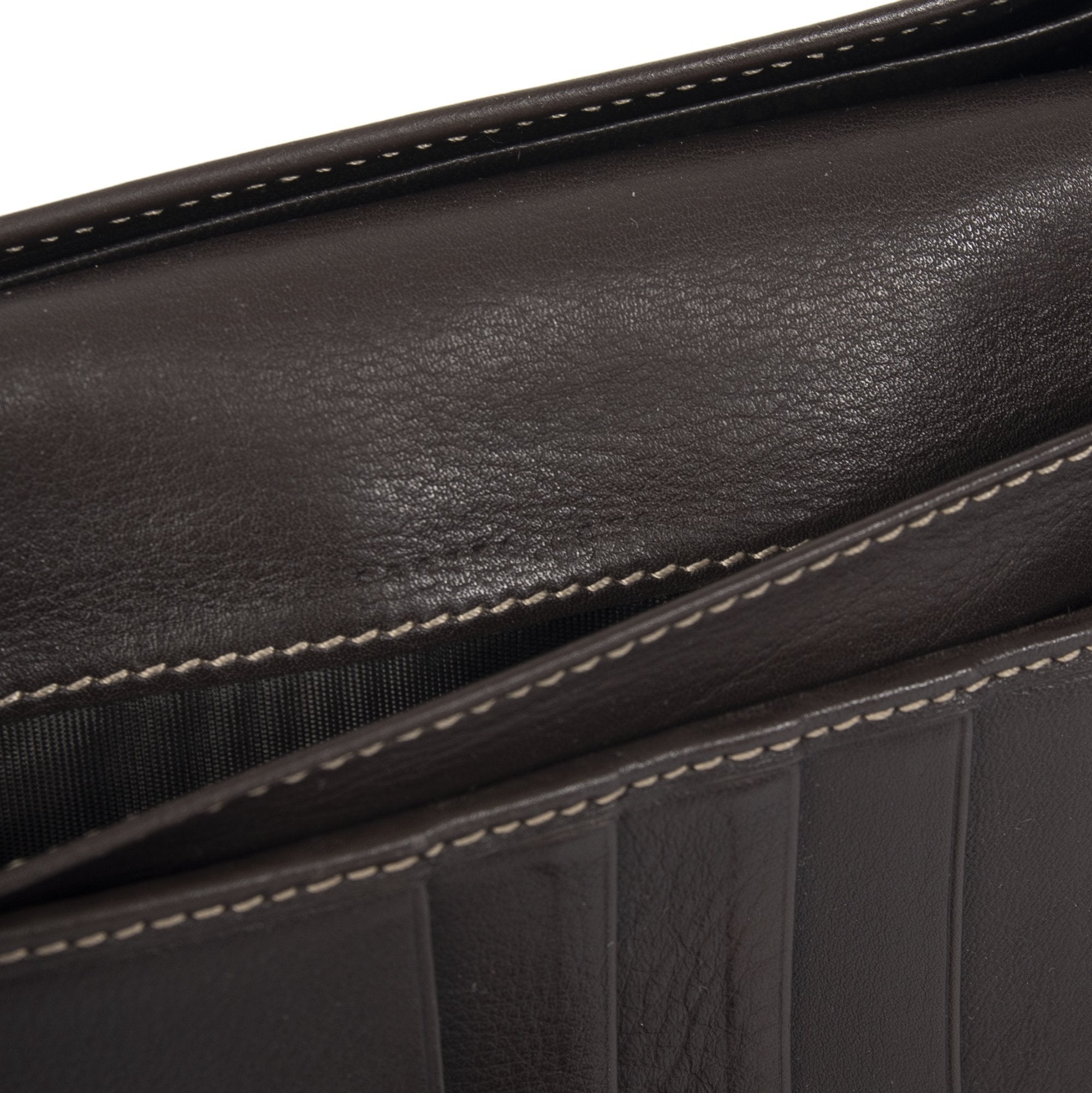 Condition: Good; moderate surface scratches and tarnishing at hardware; some scuffing at exterior leather trim and corners; slight scuffing at exterior corners; light scratches and creasing at interior leather