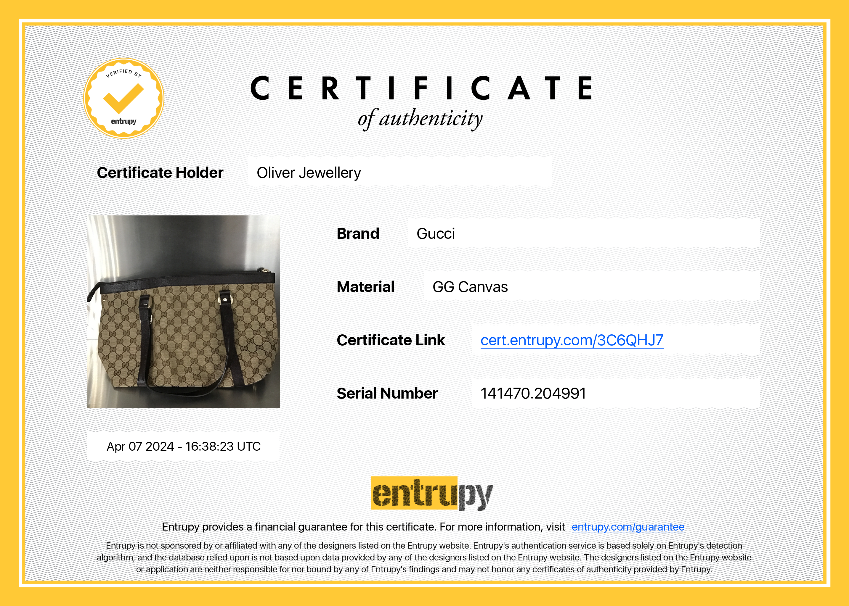 Entrupy Certificate of Authenticity