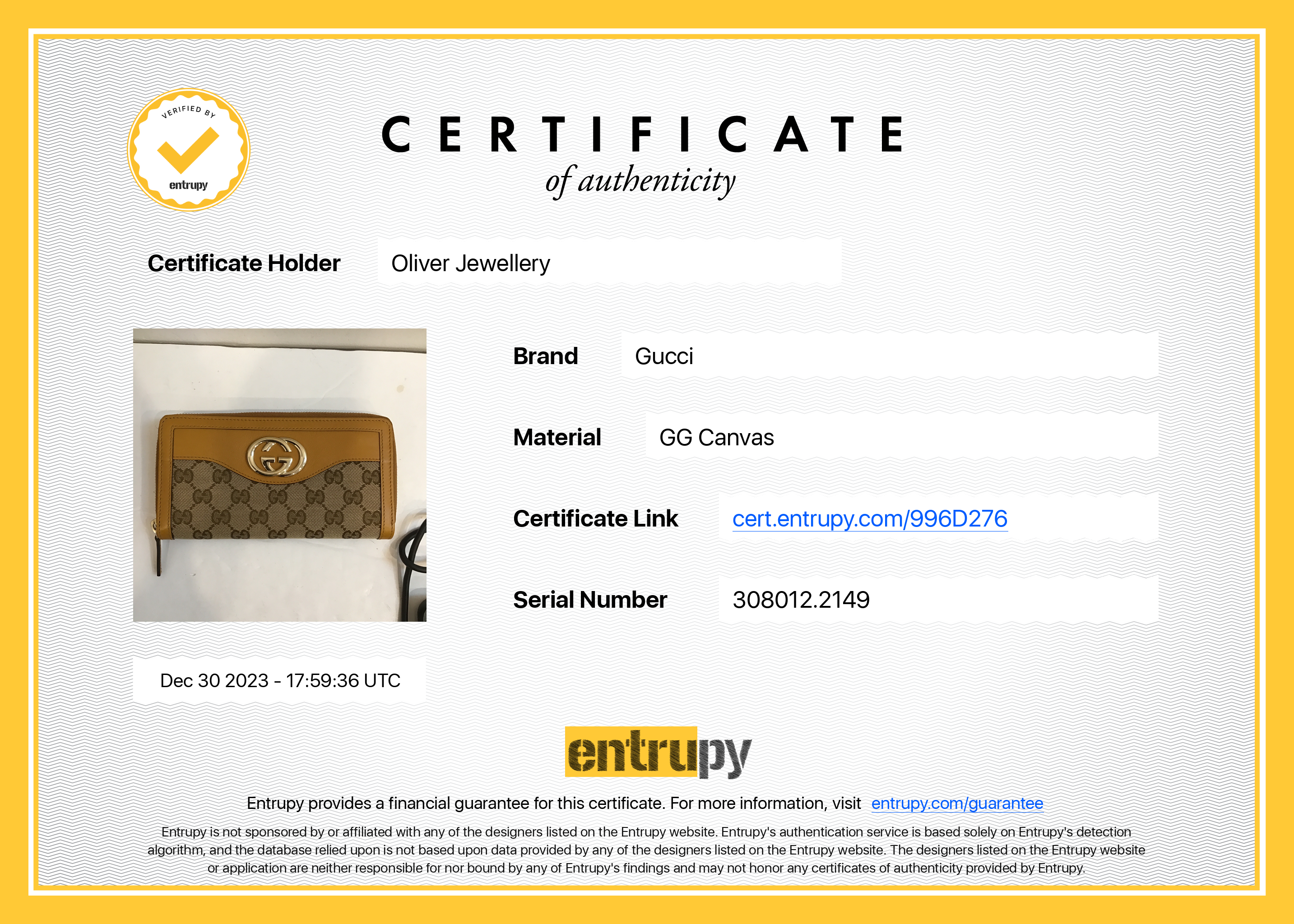 Entrupy Certificate of Authenticity