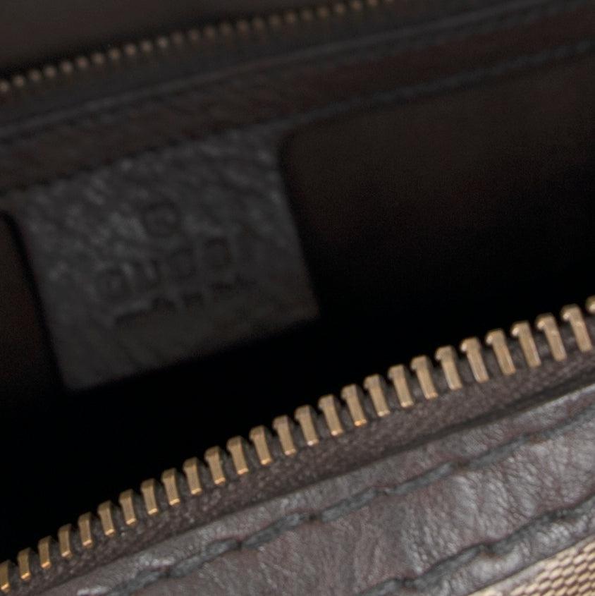 Condition: Good; slight surface scratches at hardware; slight scuffing at exterior leather trim; missing studs and slight wear at exterior embroidered accents; slight staining at interior