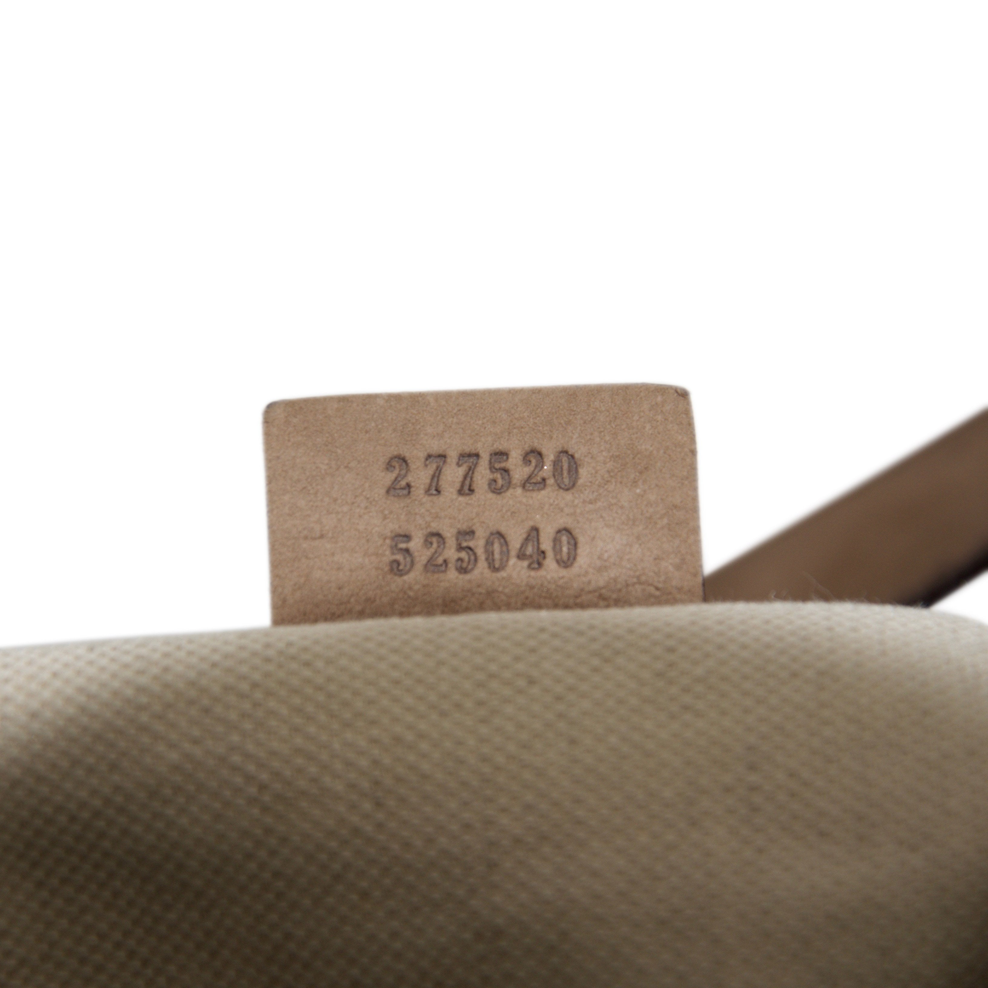 Condition: Good; some surface scratches and tarnishing at hardware; some wear and scuffs at suede trim and strap; clean interior