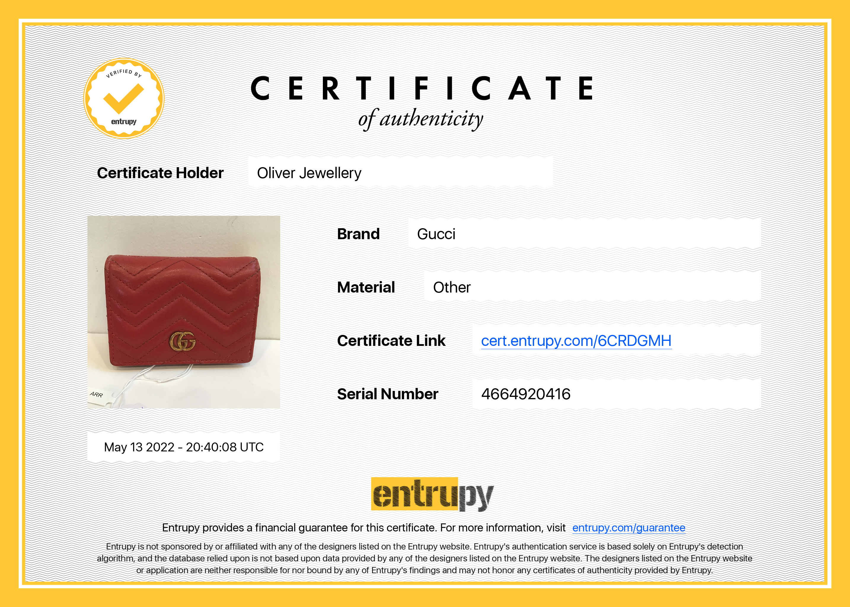 Included Items: Original Gucci Box, Dust Bag, Booklet and Entrupy Certificate of Authenticity #: 6CRDGMH