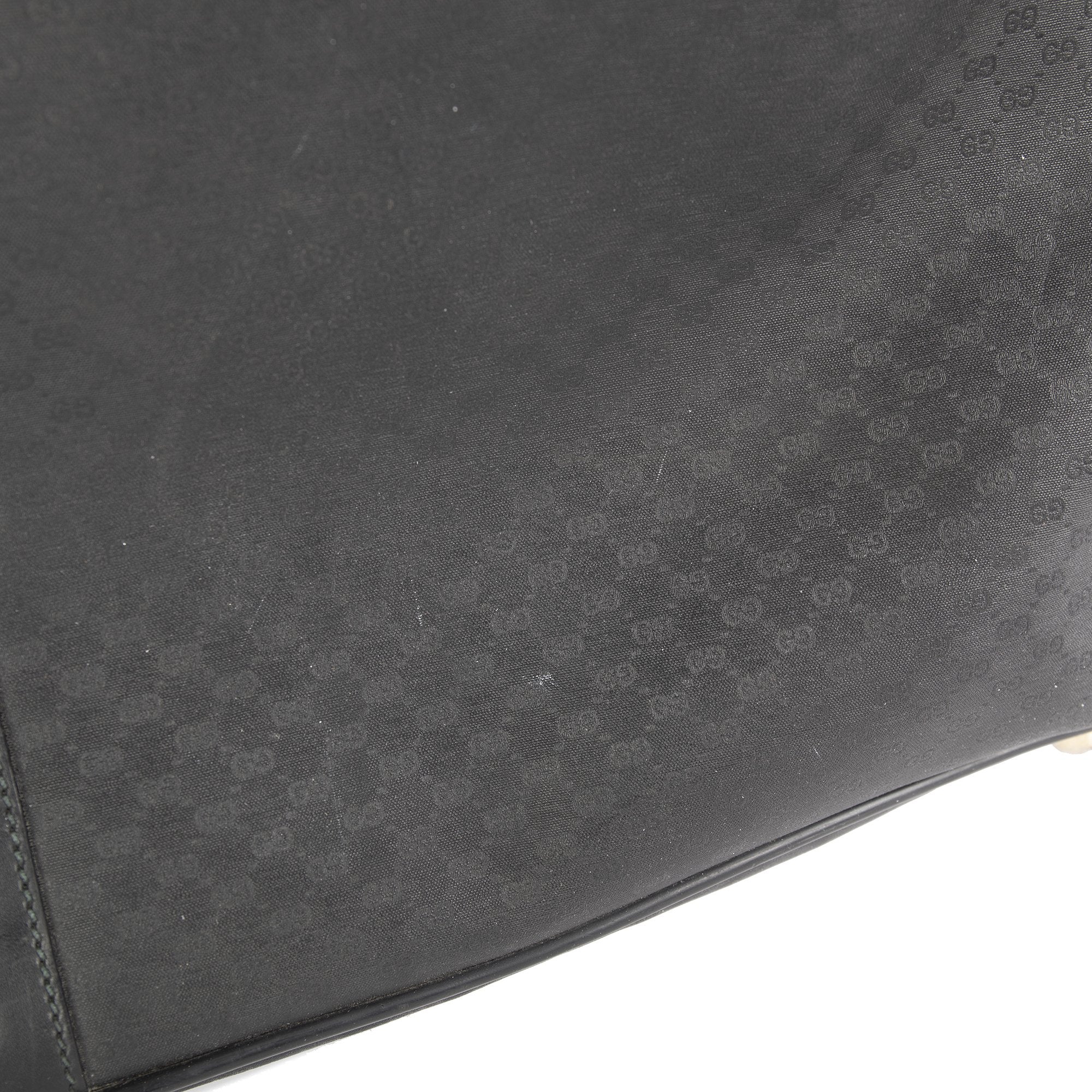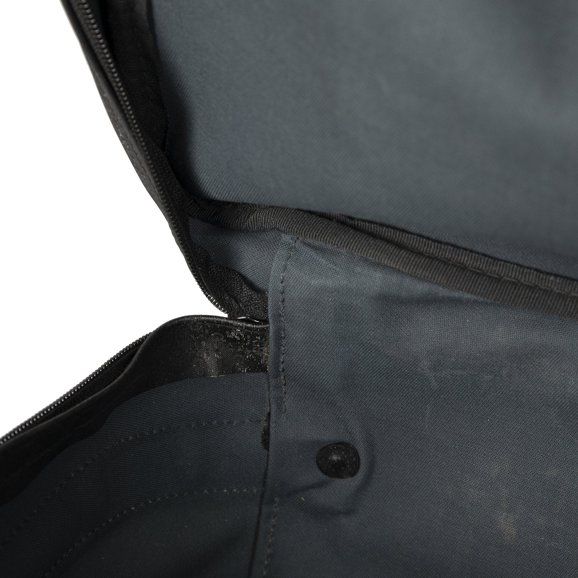 Condition: Fair; some surface scratches and tarnishing at hardware; some scratches throughout exterior canvas; moderate scuffing throughout exterior leather trim; slight marks at interior; missing buckle of one interior compression strap