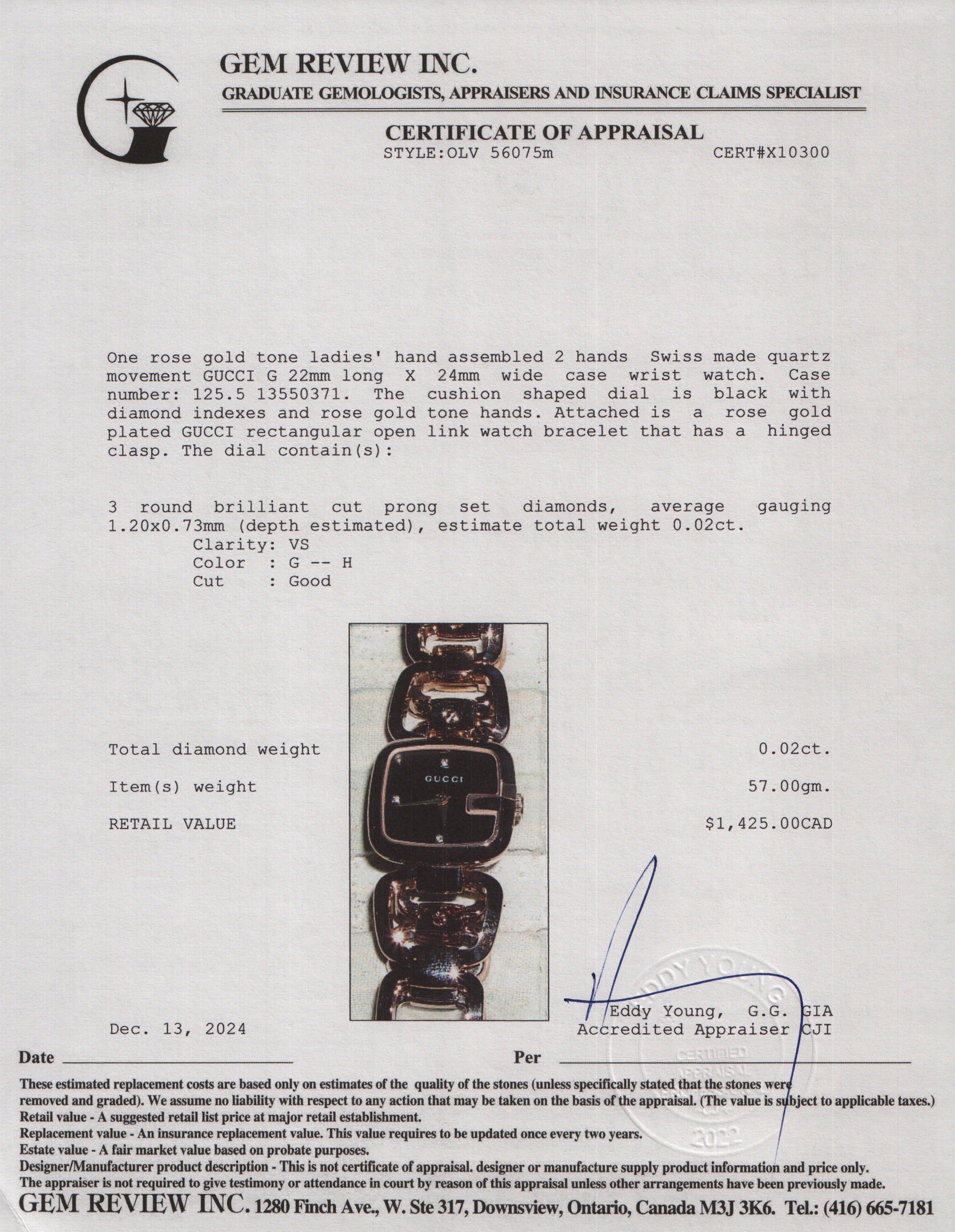Gold Plated Stainless Steel G- Black Diamond Dial Watch w/ Box & Papers
