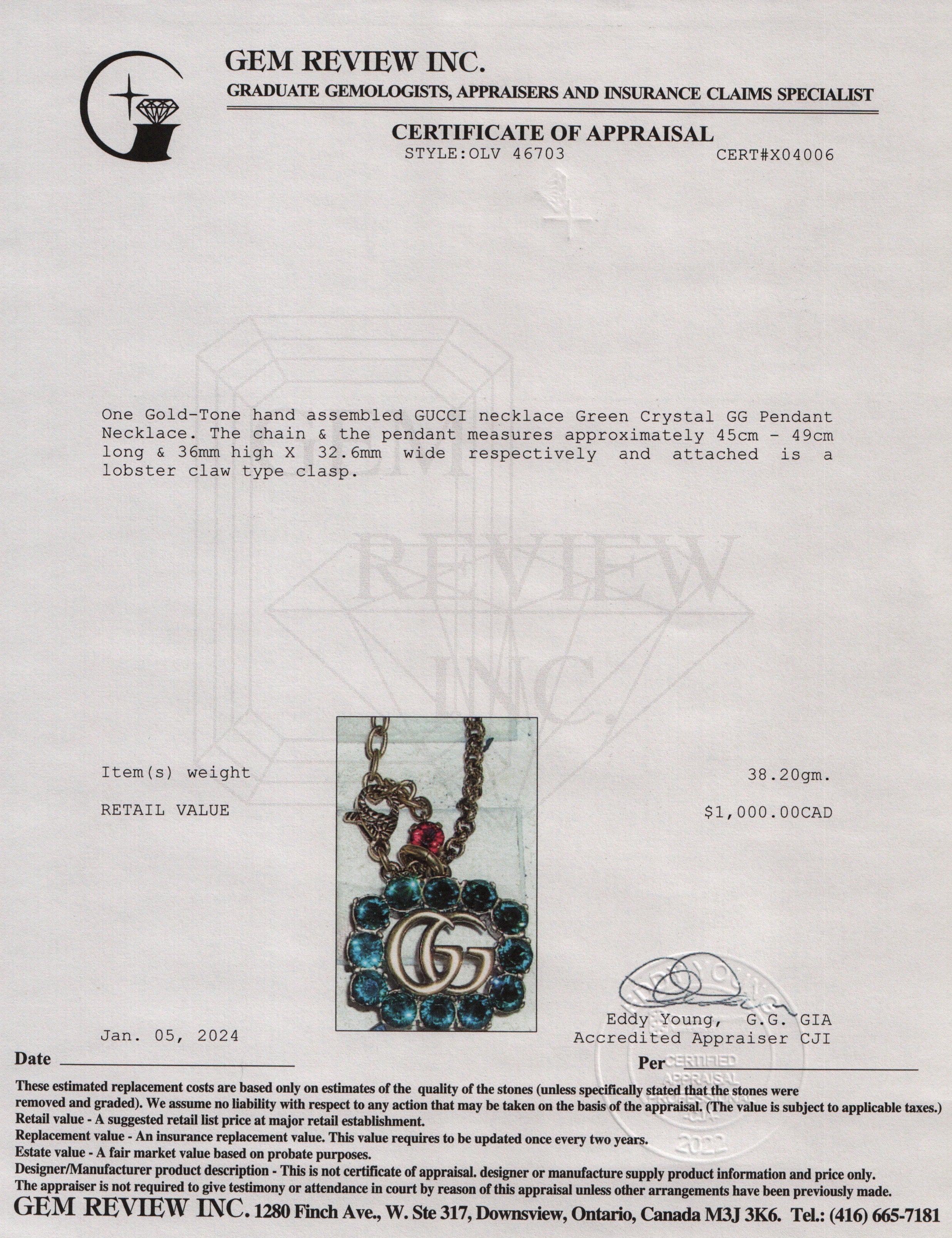 Gold-Tone Metal Green Crystal GG Pendant Necklace