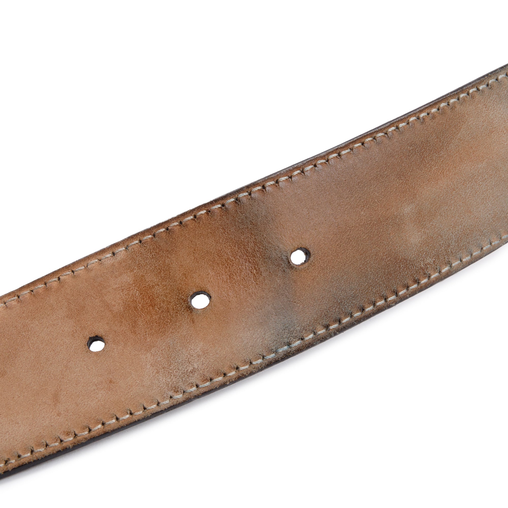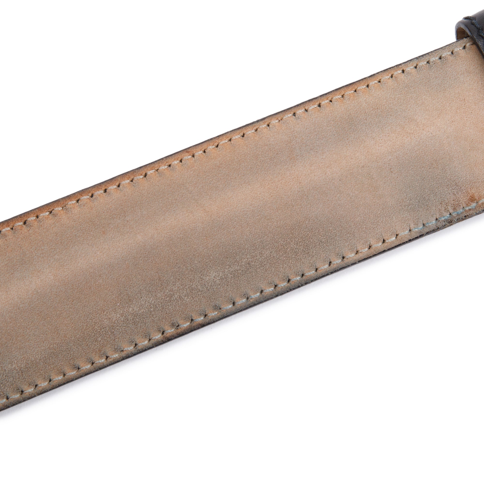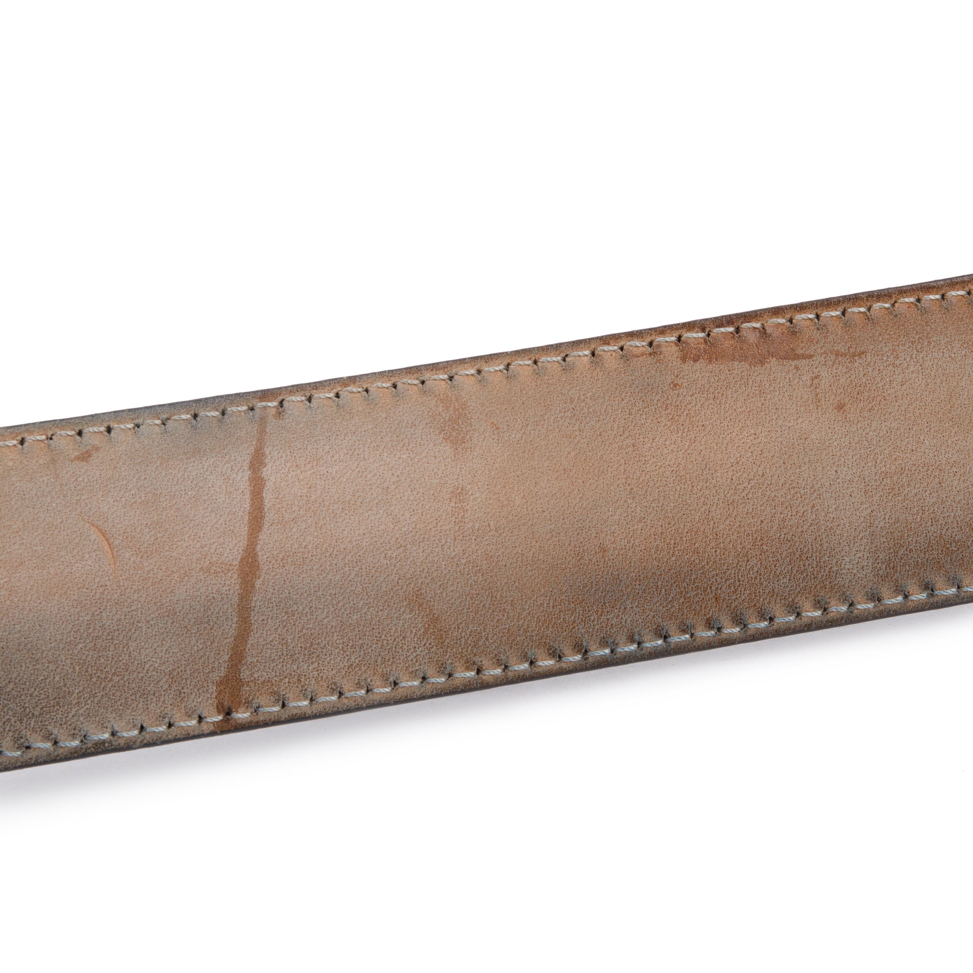Condition: Fair; slight scratches and creasing at leather; moderate discoloration and wear at interior suede