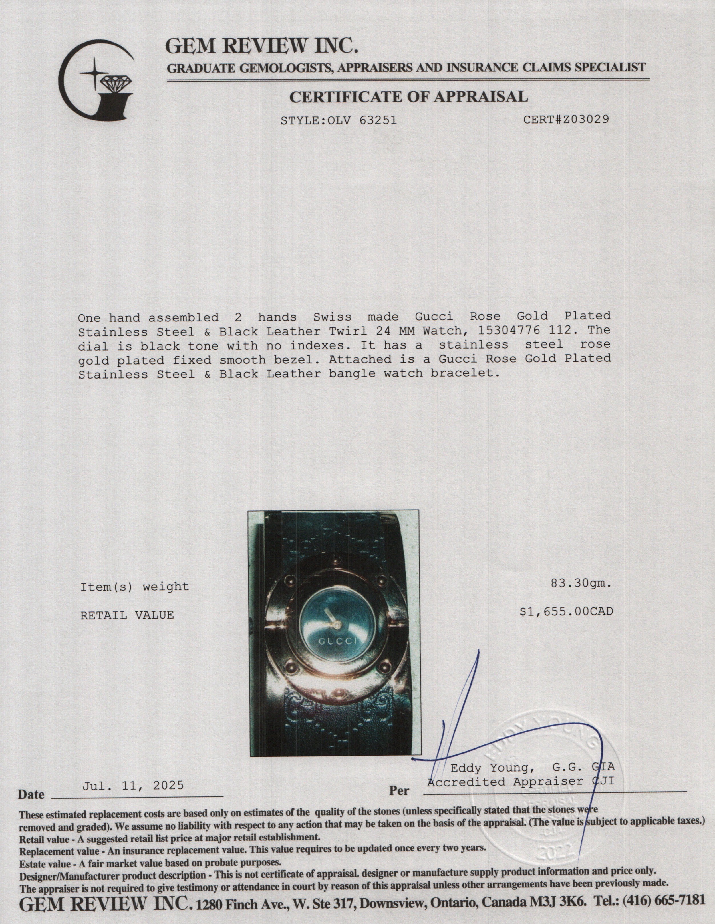 Rose Gold Plated Stainless Steel & Black Leather Twirl 24 MM Watch w/ Box & Papers