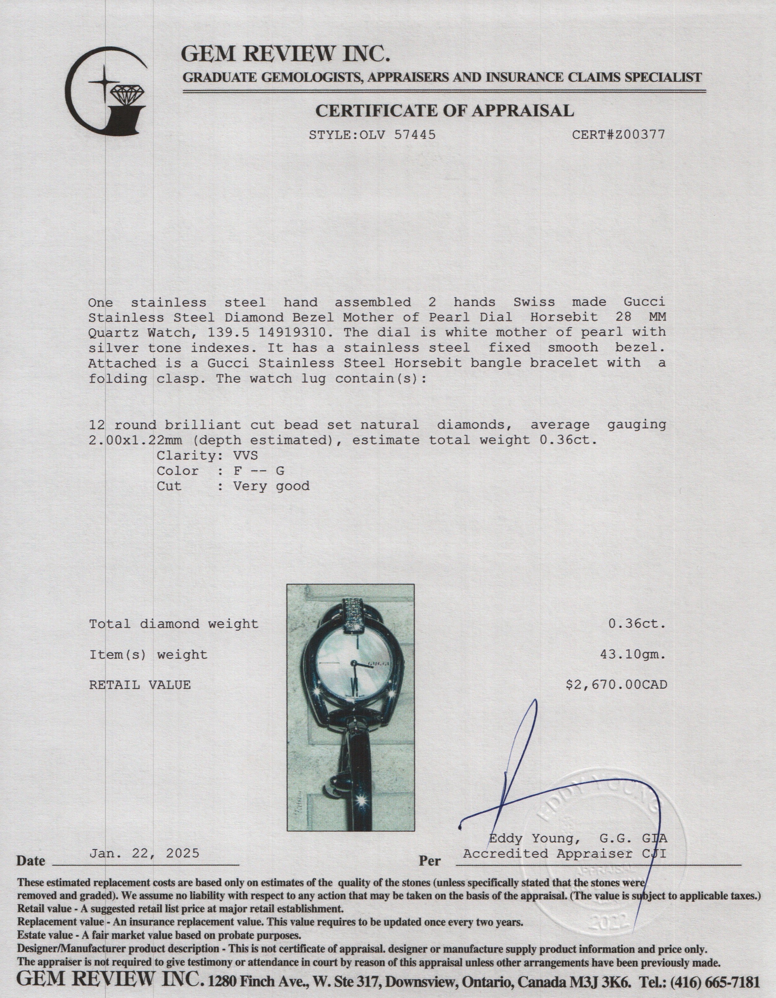 Stainless Steel Diamond Bezel Mother of Pearl Dial Horsebit 28 MM Quartz Watch