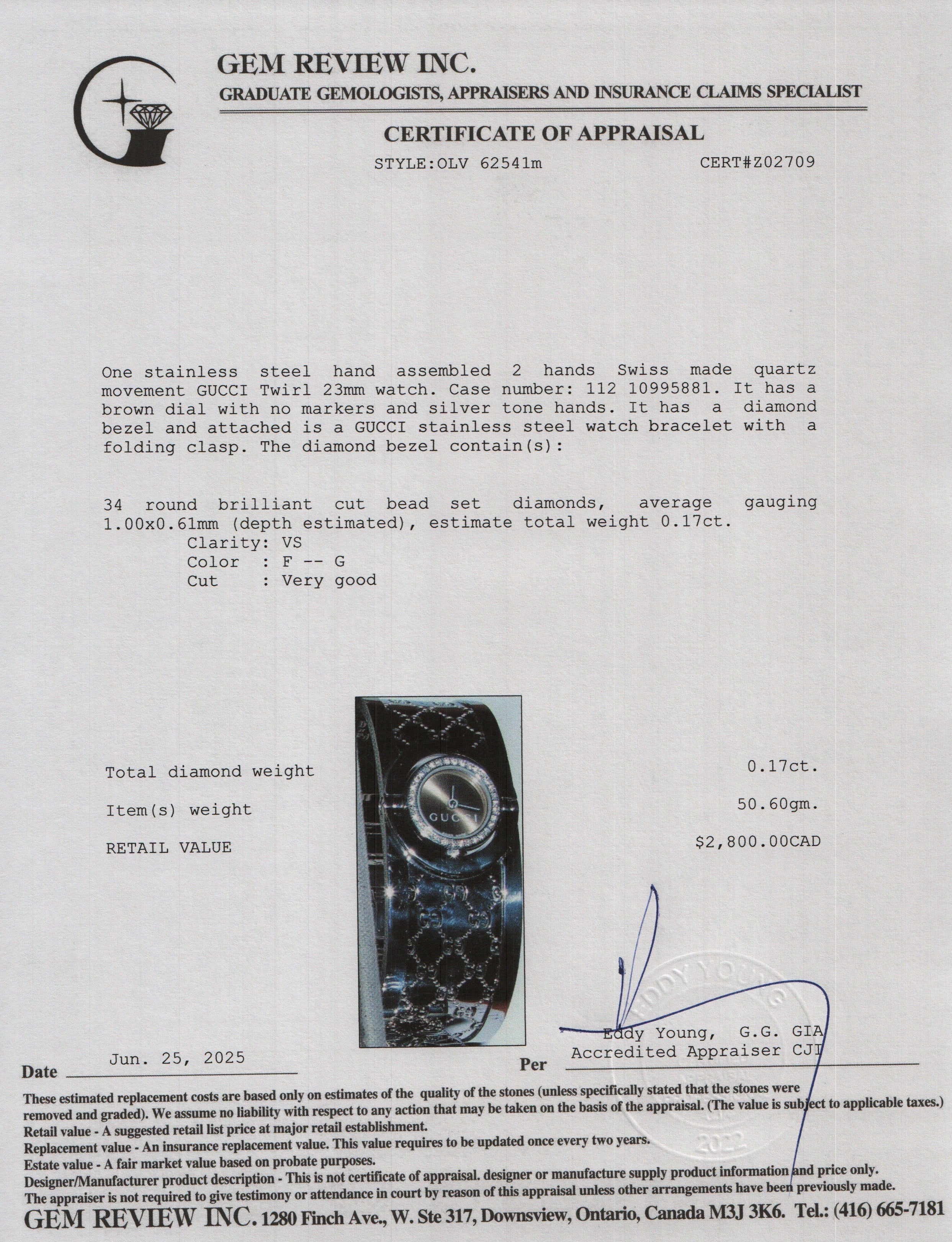 Stainless Steel Diamond Bezel Twirl 23 MM Quartz Watch Brown Dial w/ Box & Papers