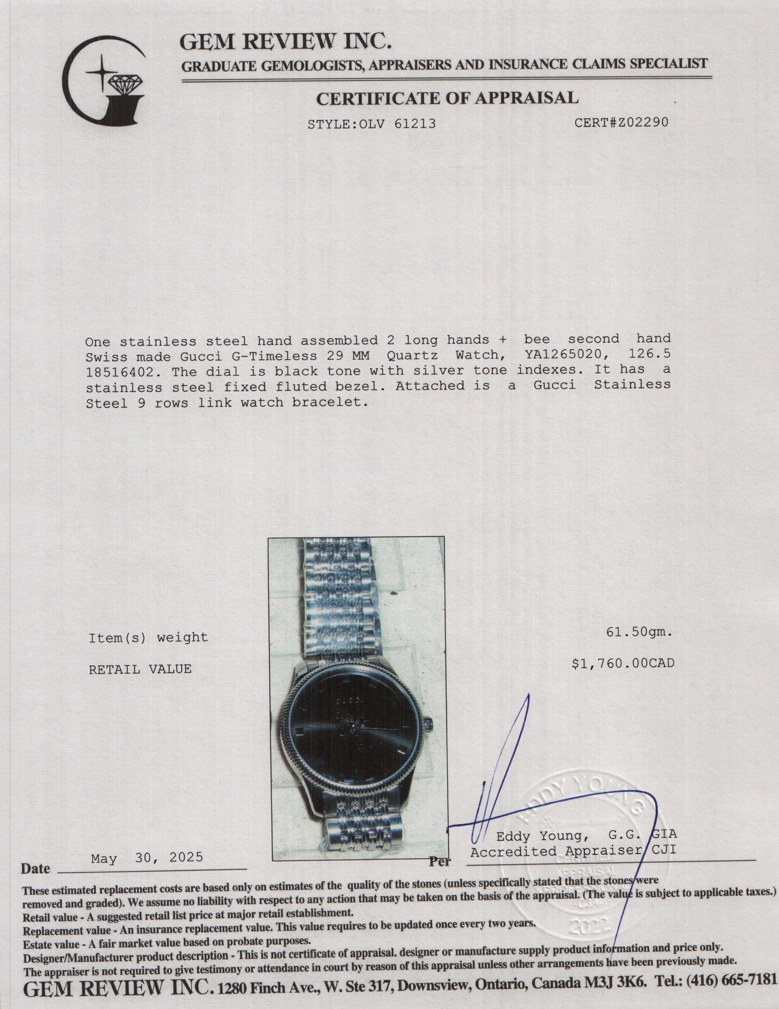 Stainless Steel G-Timeless 29 MM Quartz Watch Slim Black Bee Dial w/ Box YA1265020