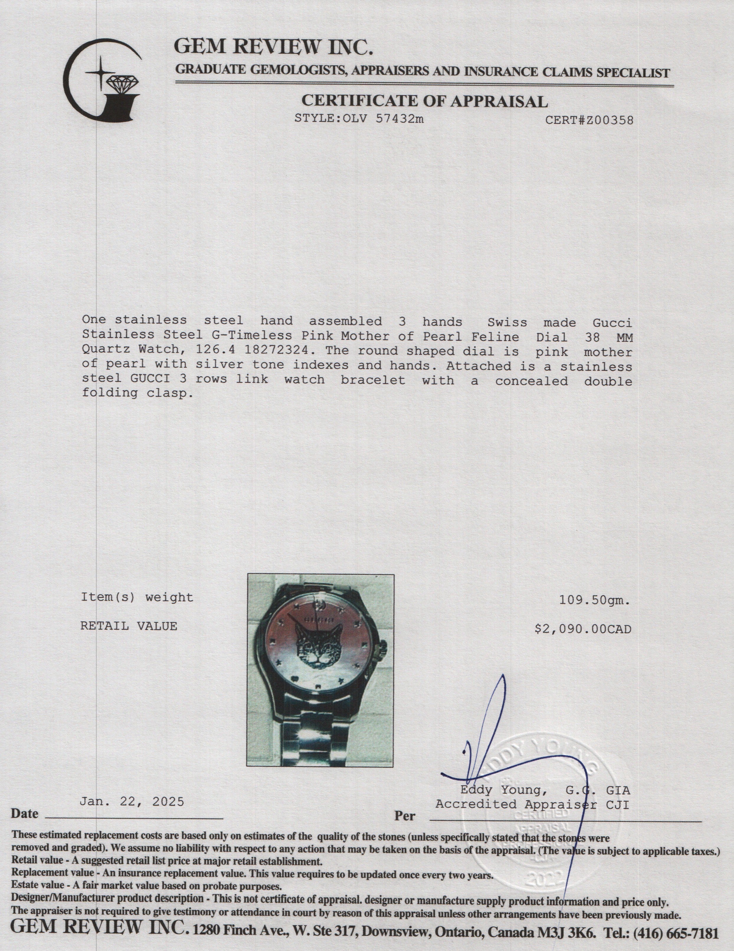 Stainless Steel G-Timeless Pink Mother of Pearl Feline Dial 38 MM Quartz Watch