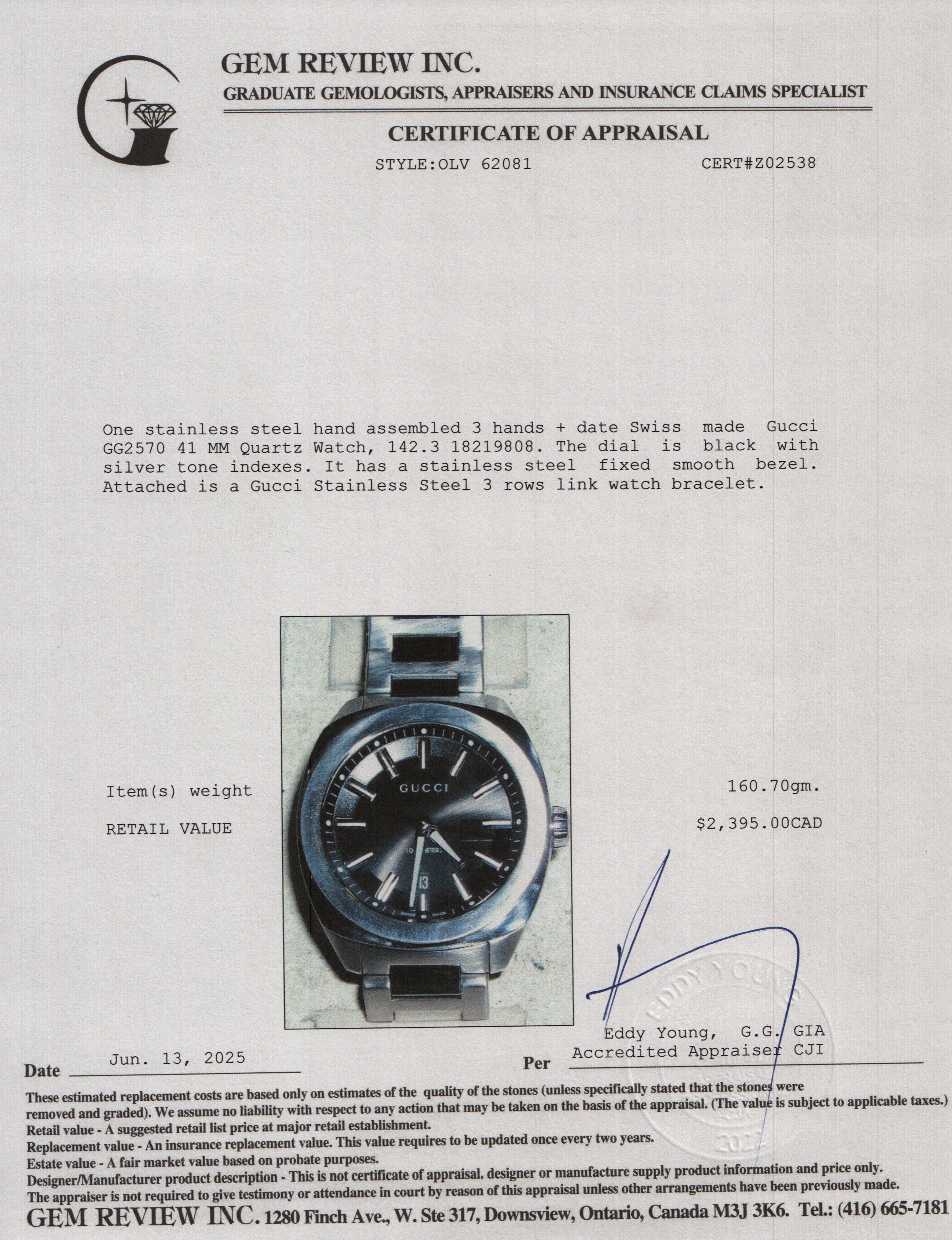 Stainless Steel GG2570 41 MM Quartz Watch Black Dial w/ Box & Papers
