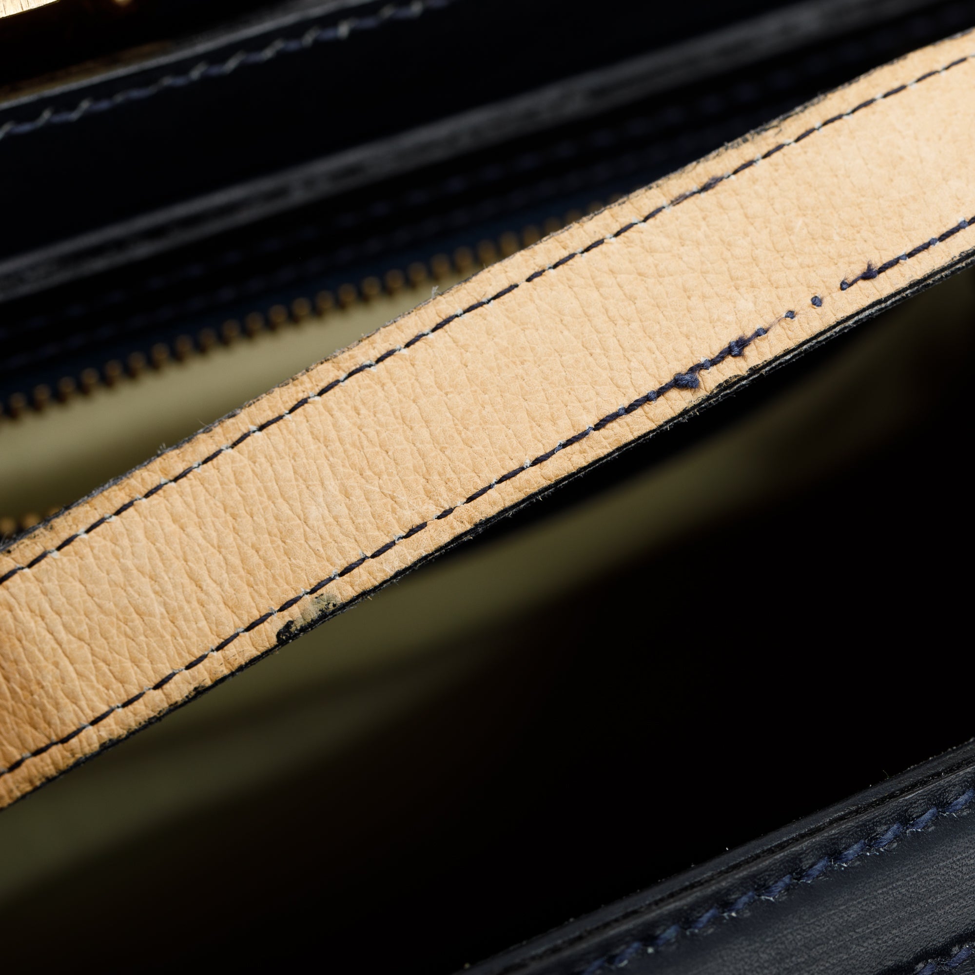 Condition: Good; slight scratches at hardware; slight scratches at exterior leather trim; slight scuffing at exterior corners and edges; slight marks and wear at interior
