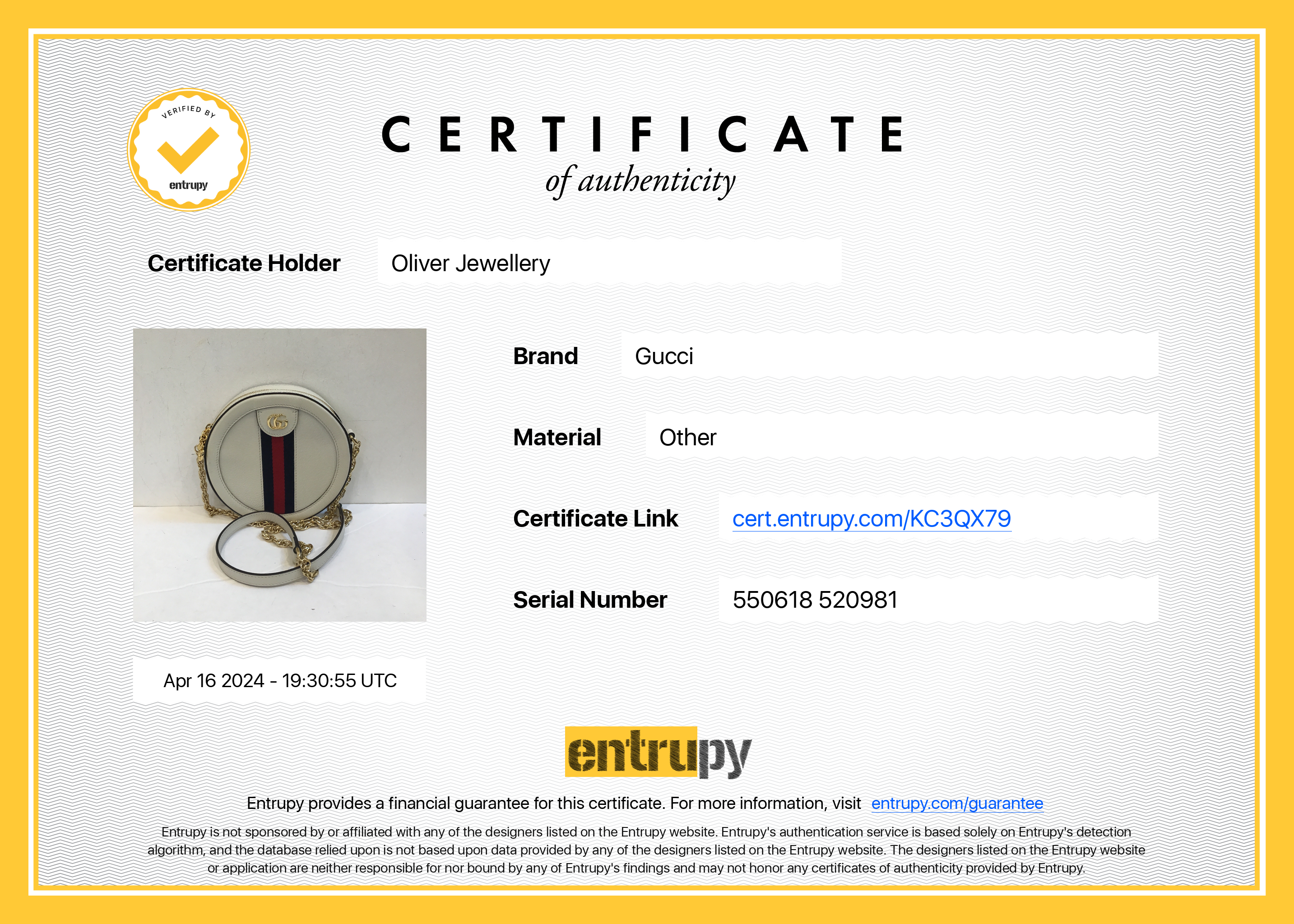 Entrupy Certificate of Authenticity