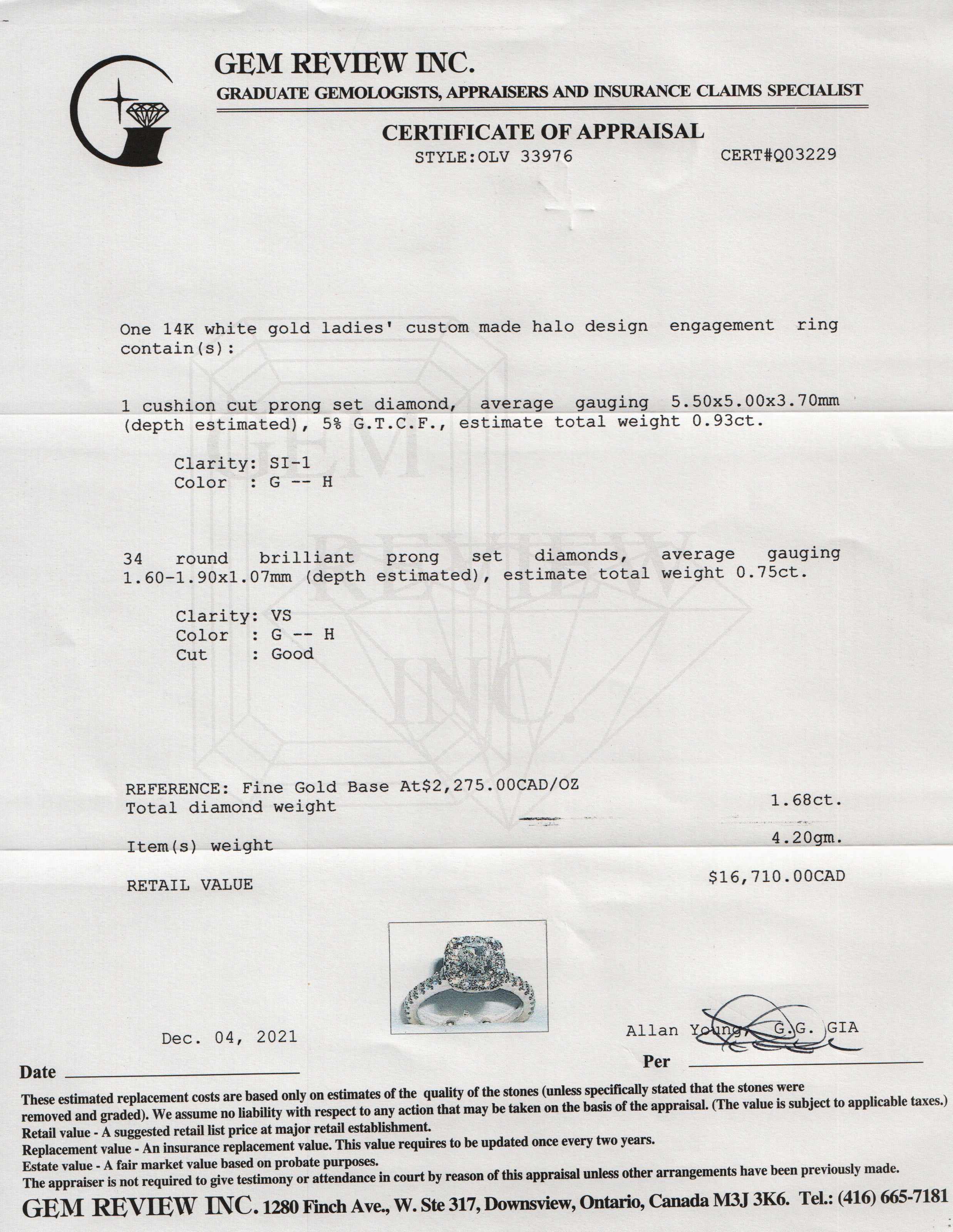 - 1 Cushion Cut Diamond Weighing Approximately 0.93 ct. of S11 Clarity, G-H Colour