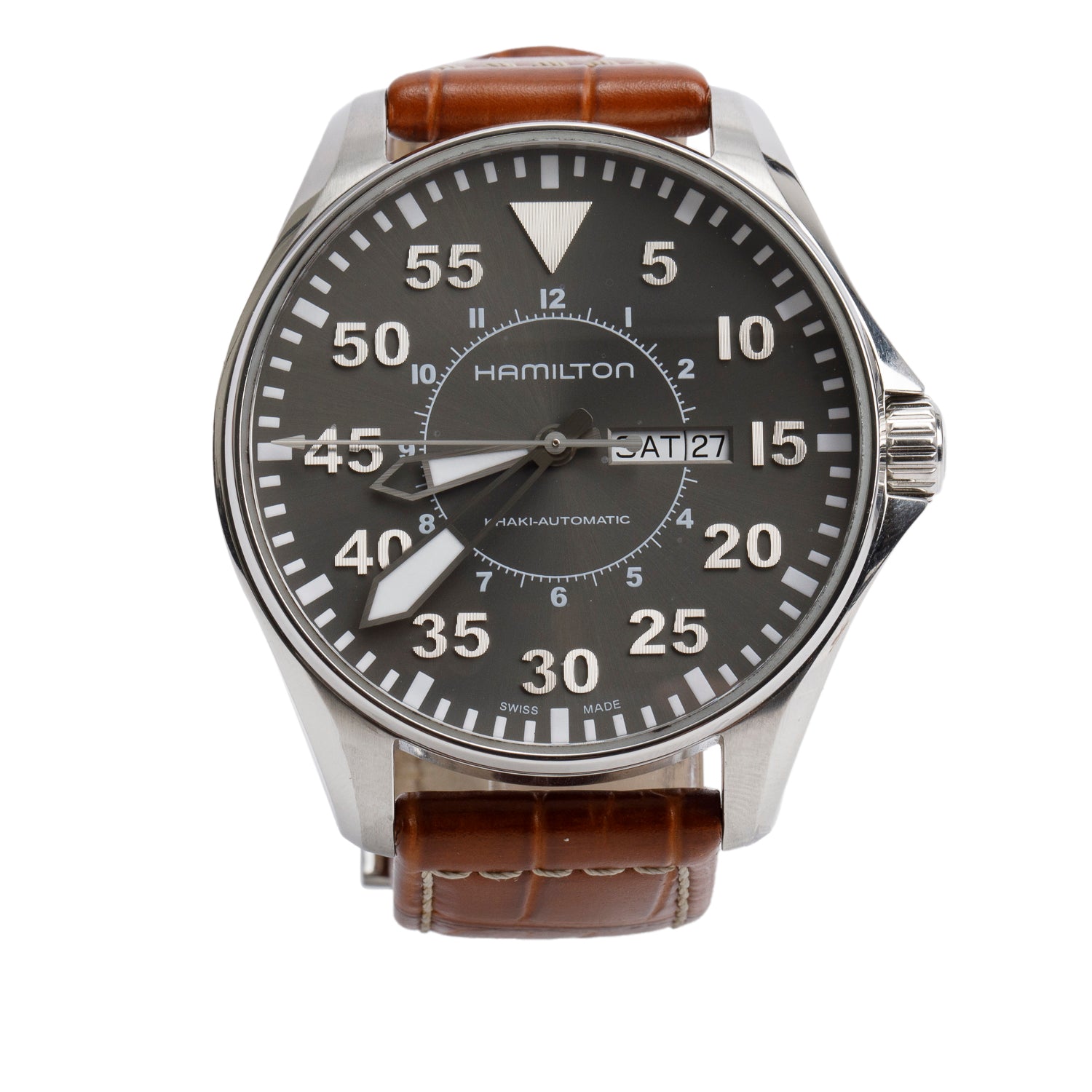 Stainless Steel Khaki Aviation Pilot Day Date 46 MM Automatic Watch H647150 w/ Box & Papers