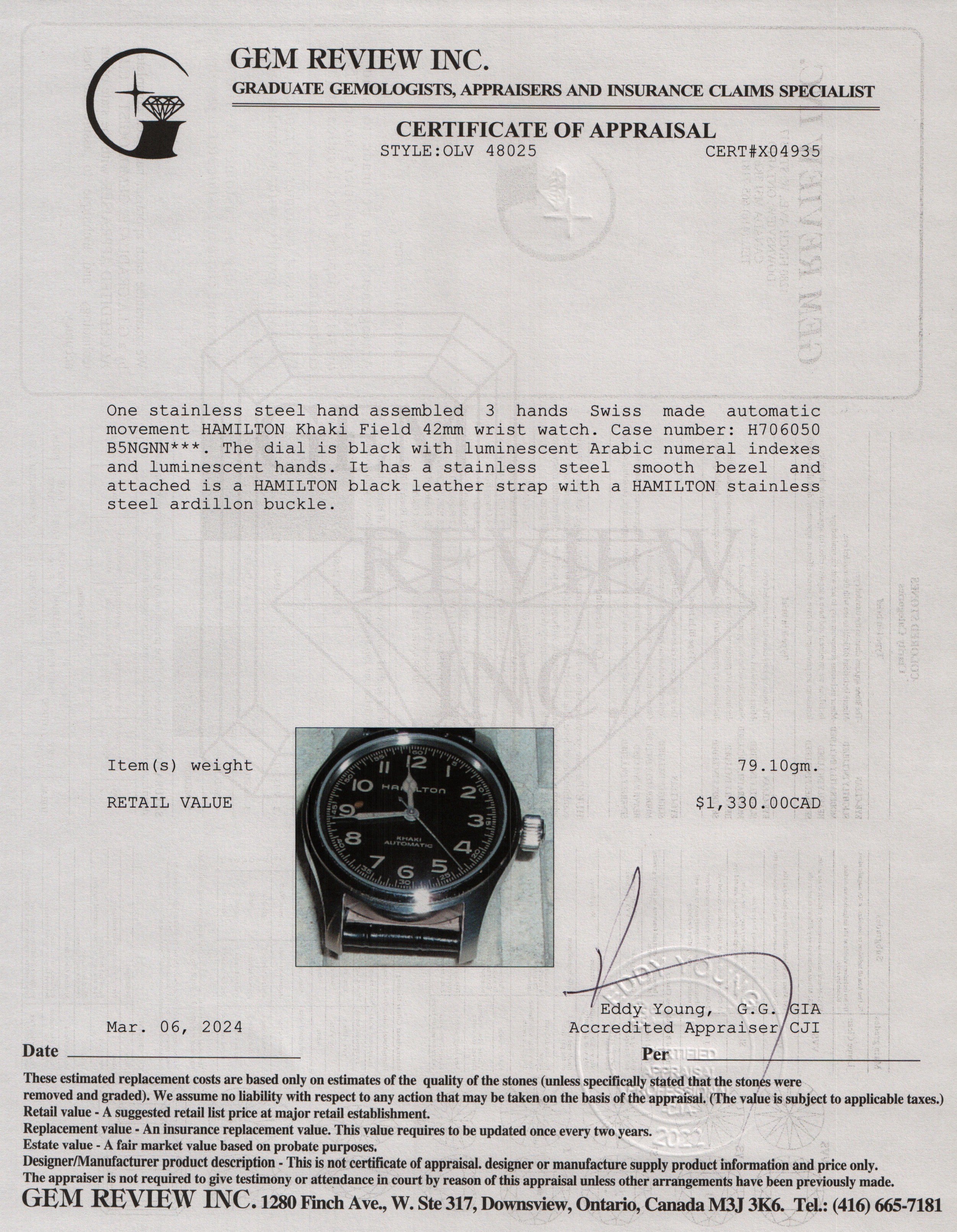 Stainless Steel Khaki Field 42 MM Automatic Watch w/ Box & Papers