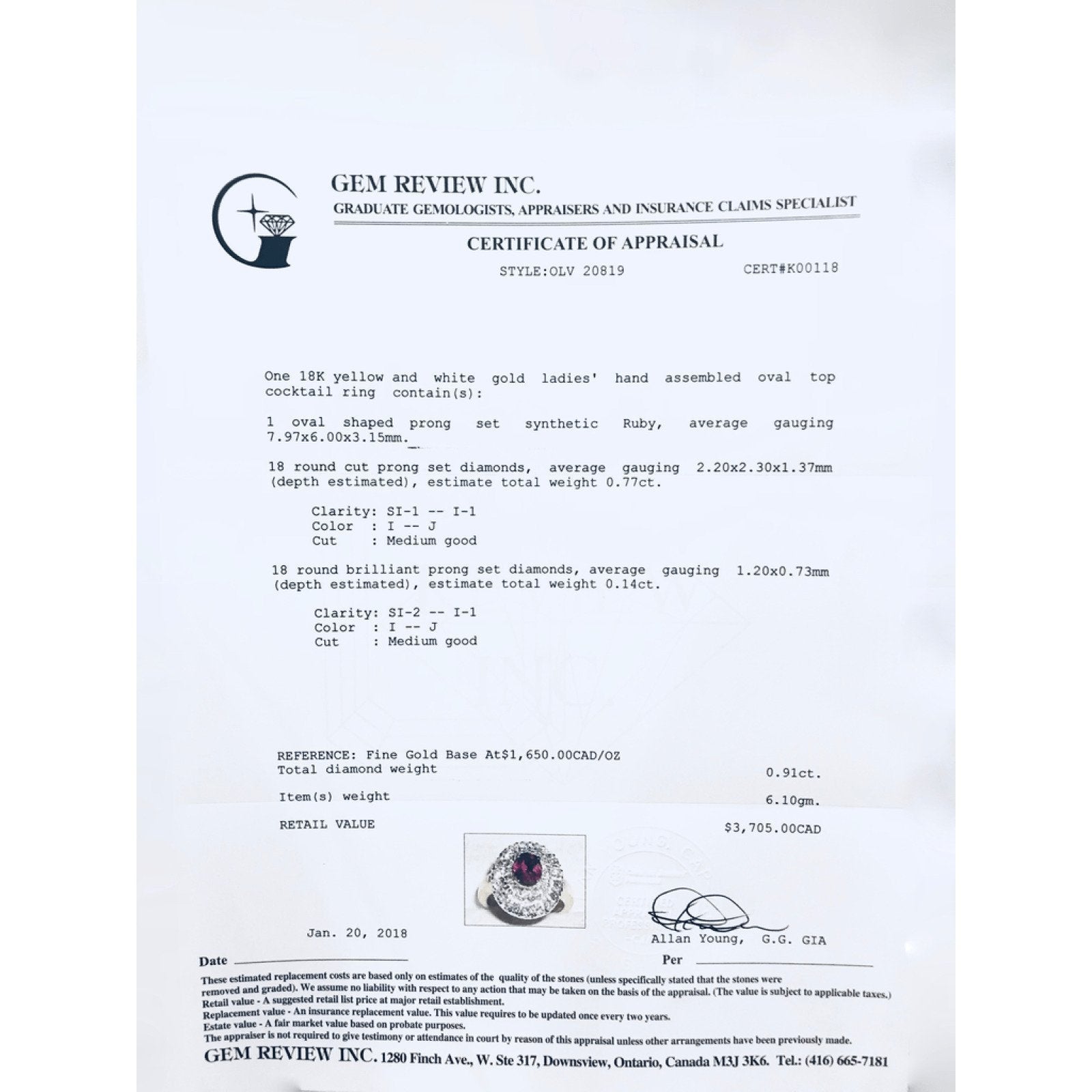 Hand Assembled Oval Top Cocktail Ring; Contains 1 Oval Shaped Synthetic Ruby; 18 Round Cut Prong Set Diamonds; 18 Round Cut Brilliant Set DIamonds: 0.91ct Approx Total DIamond Weight; Comes With Gem Review Appraisal