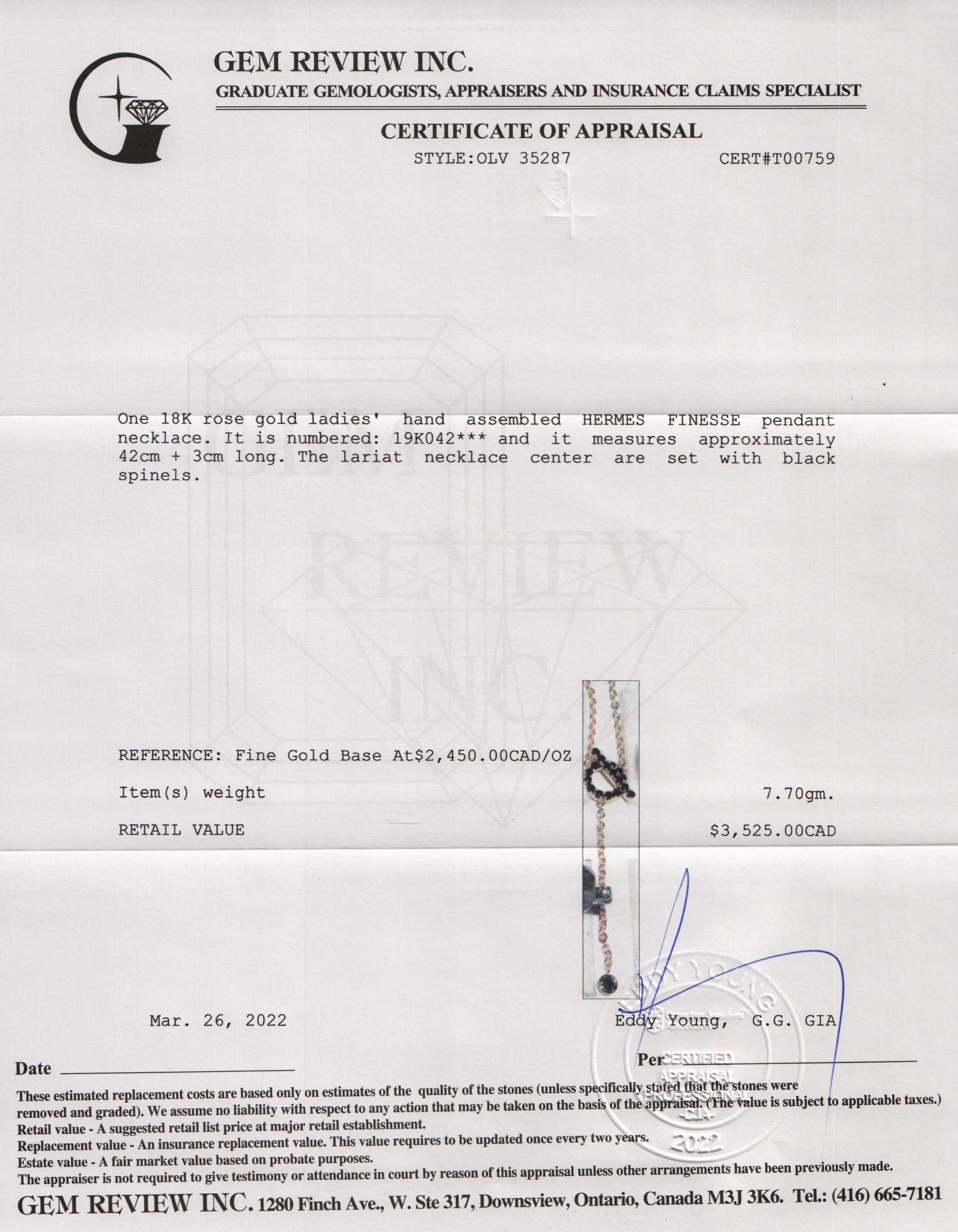 Hermes 18k Rose Gold Black Spinel Finesse Lariat Necklace
