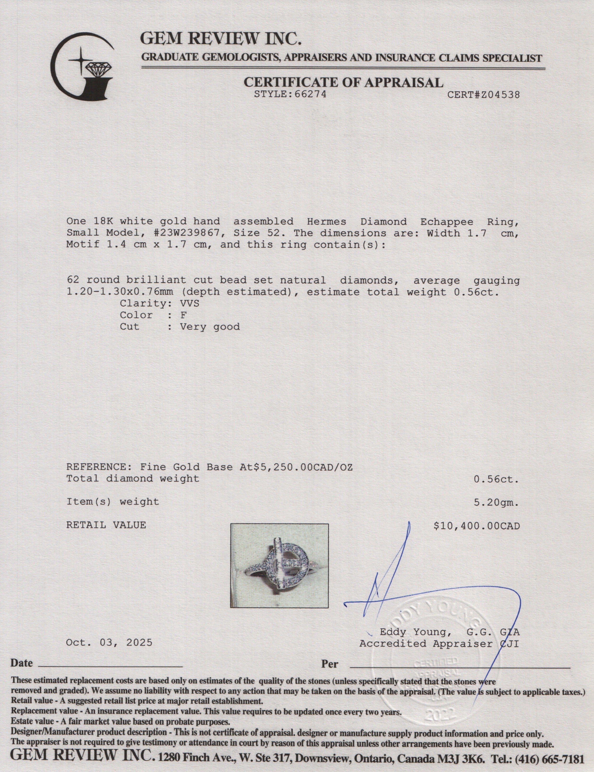 18k White Gold Diamond Echappee Ring, Small Model, Size 52 6.0 w/ Box